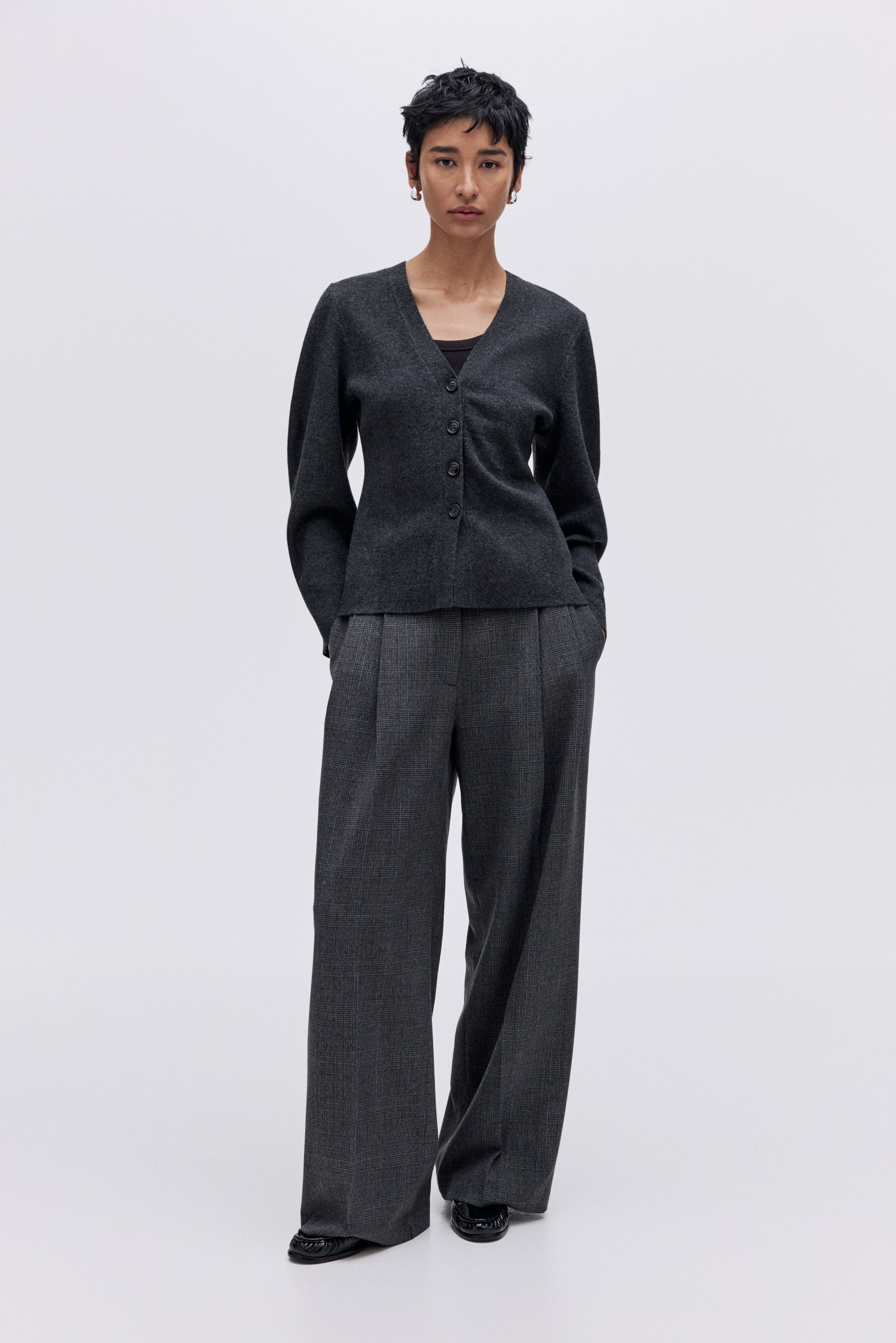 Tailored trousers in woven fabric featuring a high waist with an adjustable button tab at each side, a zip fly and an extended waistband with a concealed button and hook-and-bar fasteners. Diagonal side pockets, jetted back pockets and straight legs with pleats at the front and creases down the front and back.