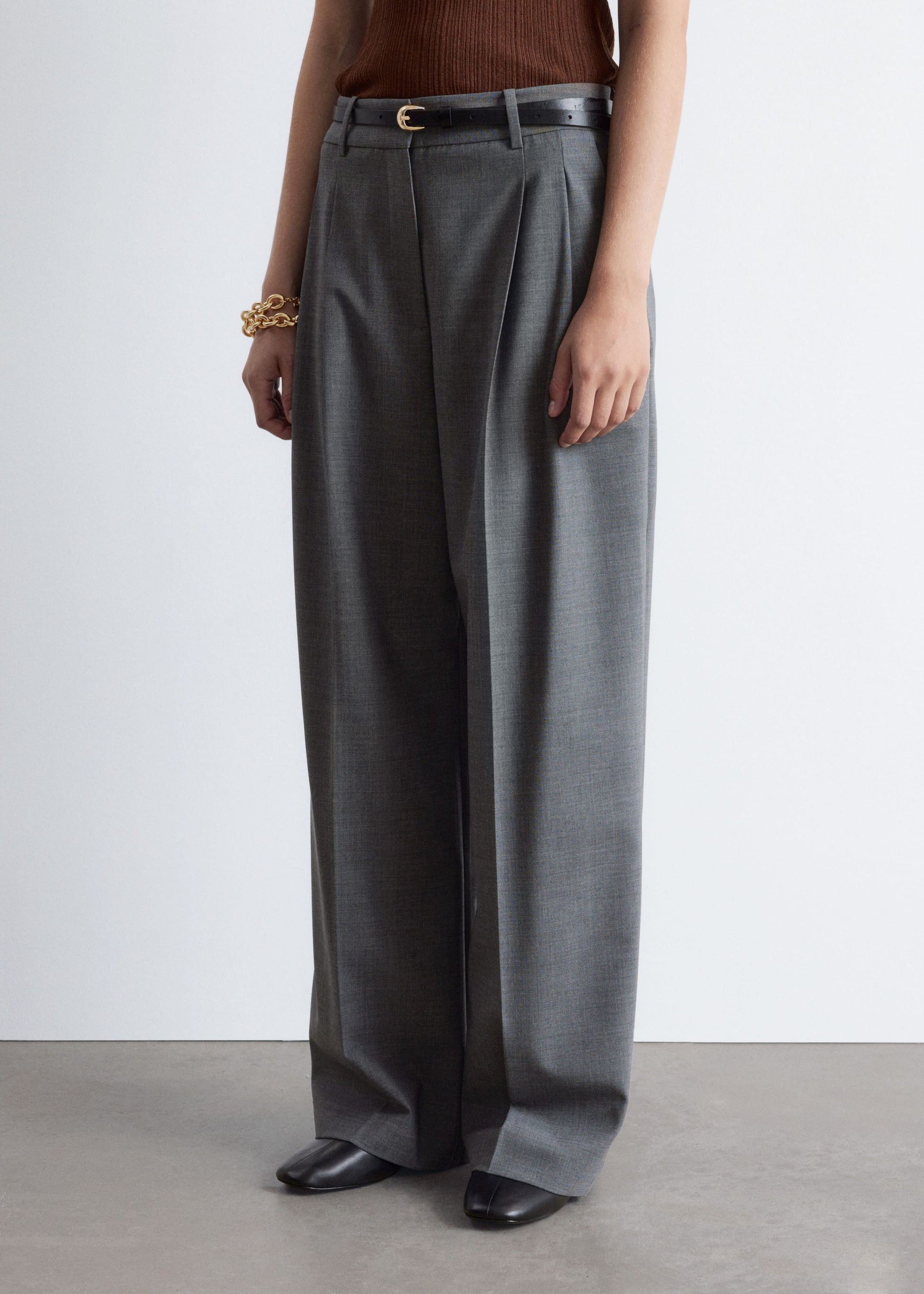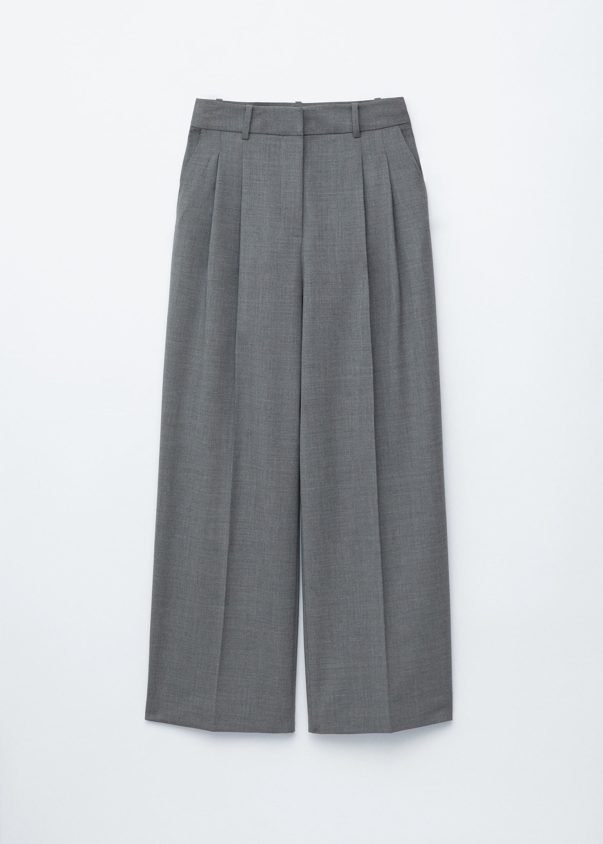 Tailored from a wool blend, these trousers are cut in a loose silhouette with long, wide legs accented by press-creases. They feature slanted side seam pockets, two welt pockets at the back, and a zip fly with hook-and-bar closure.