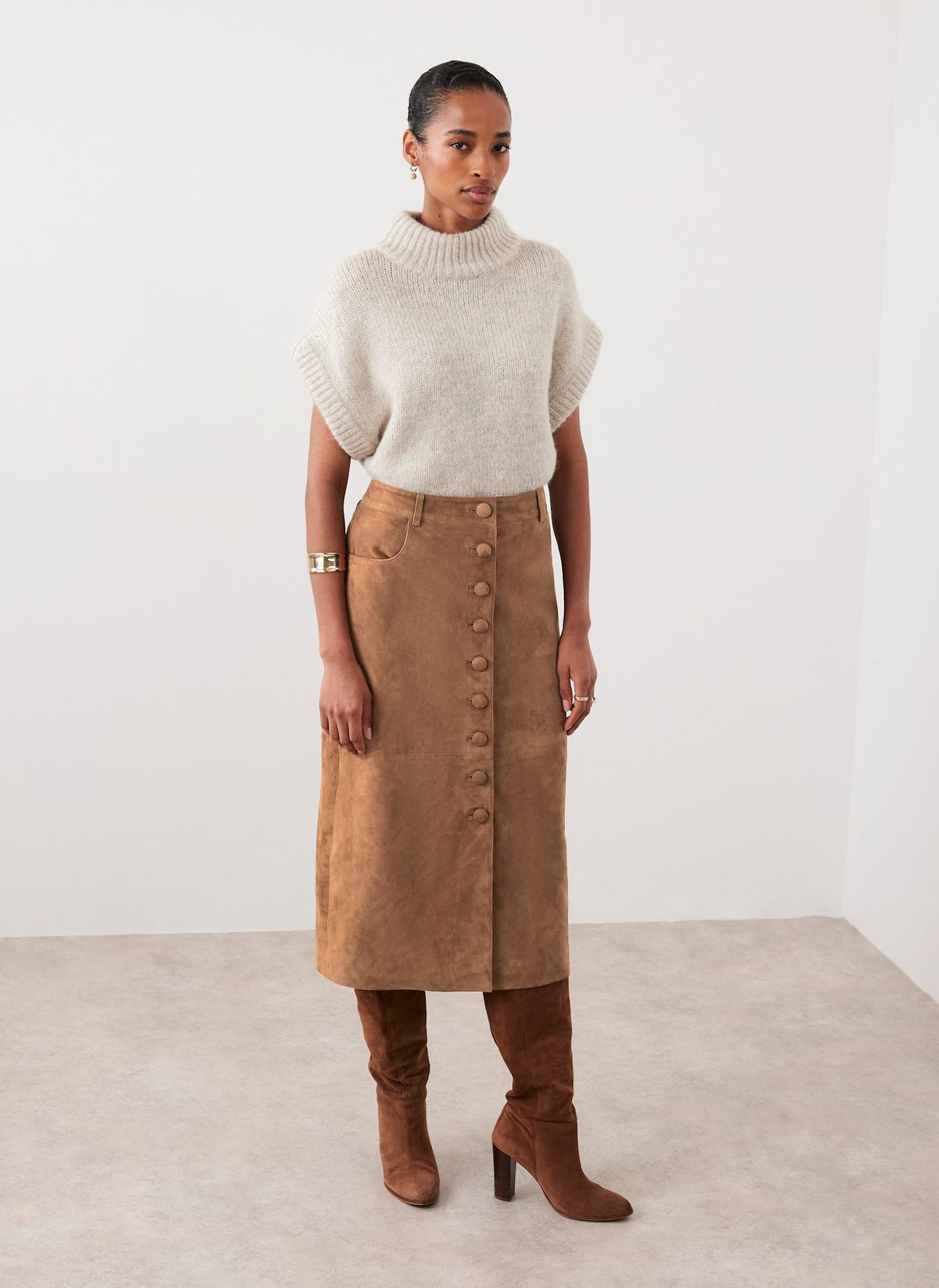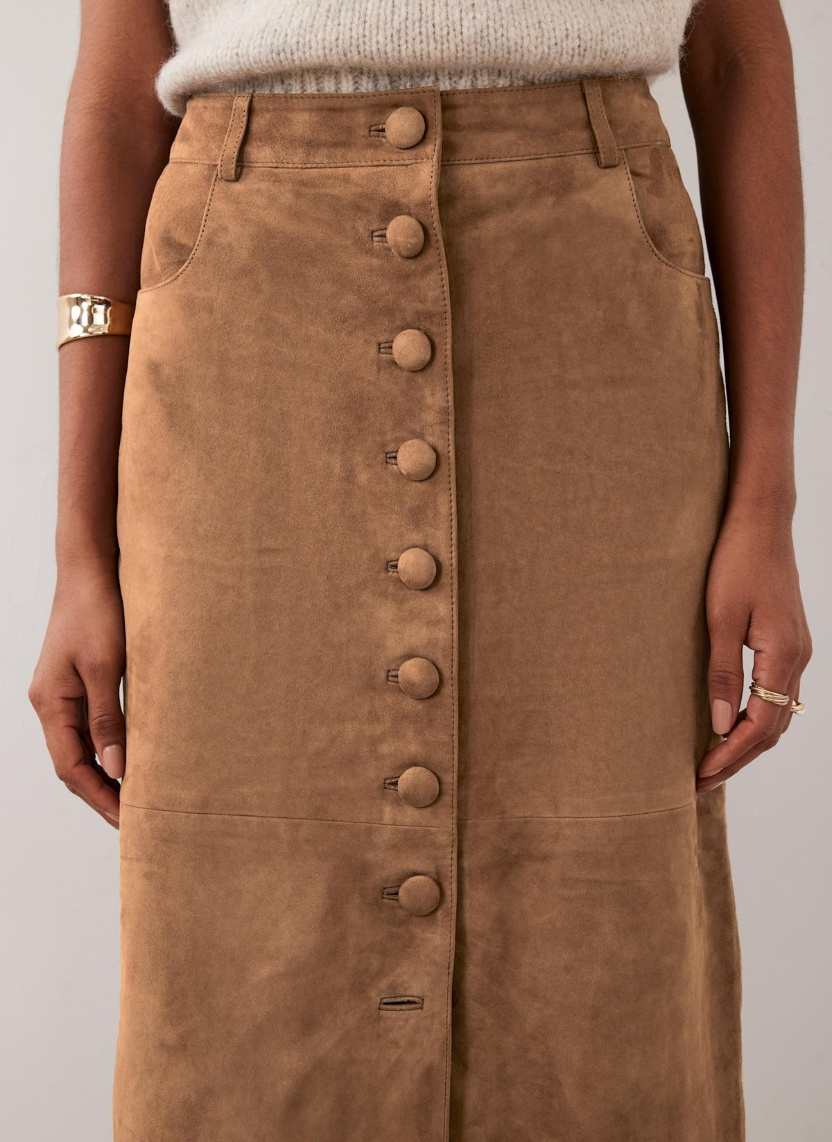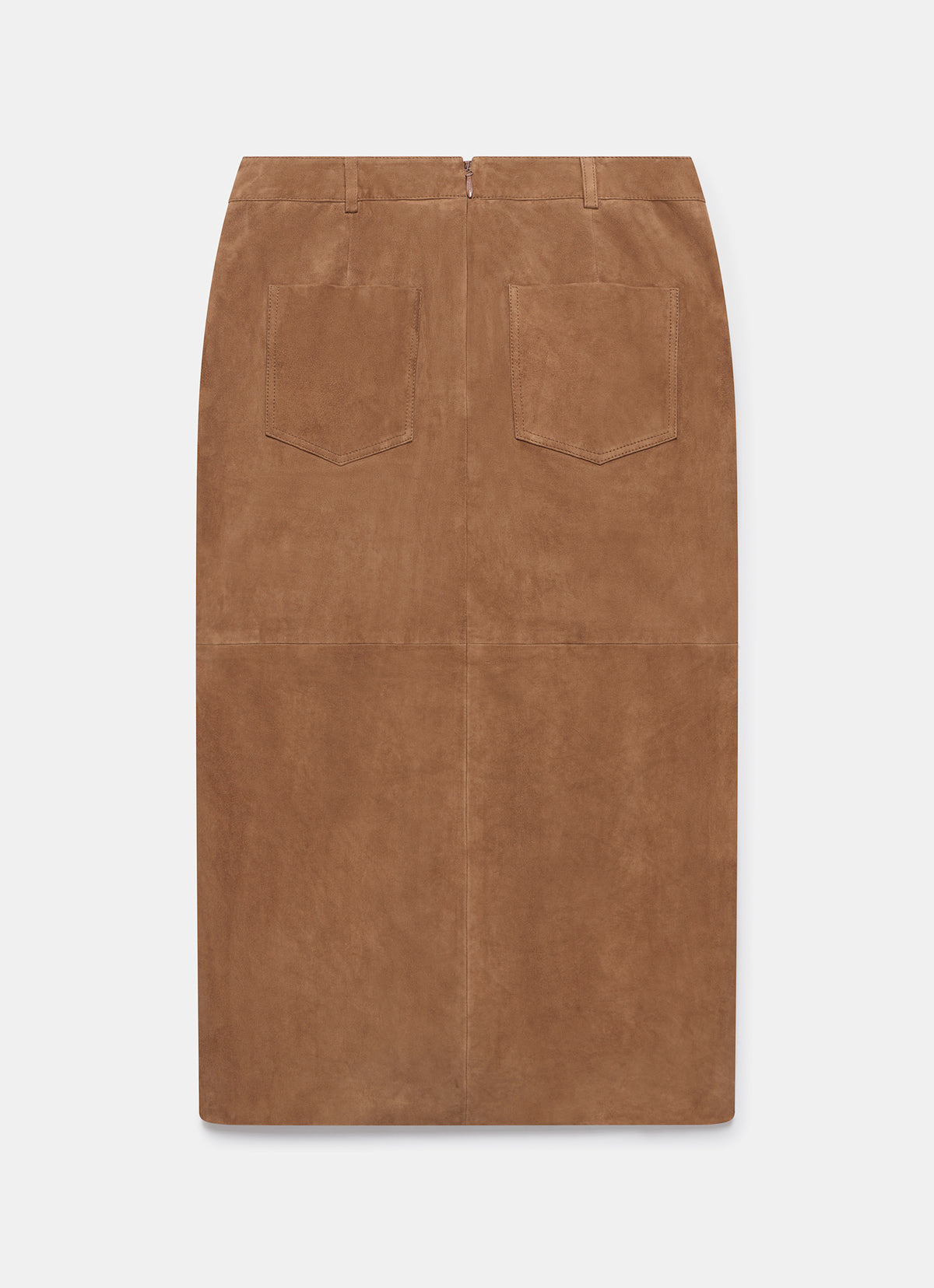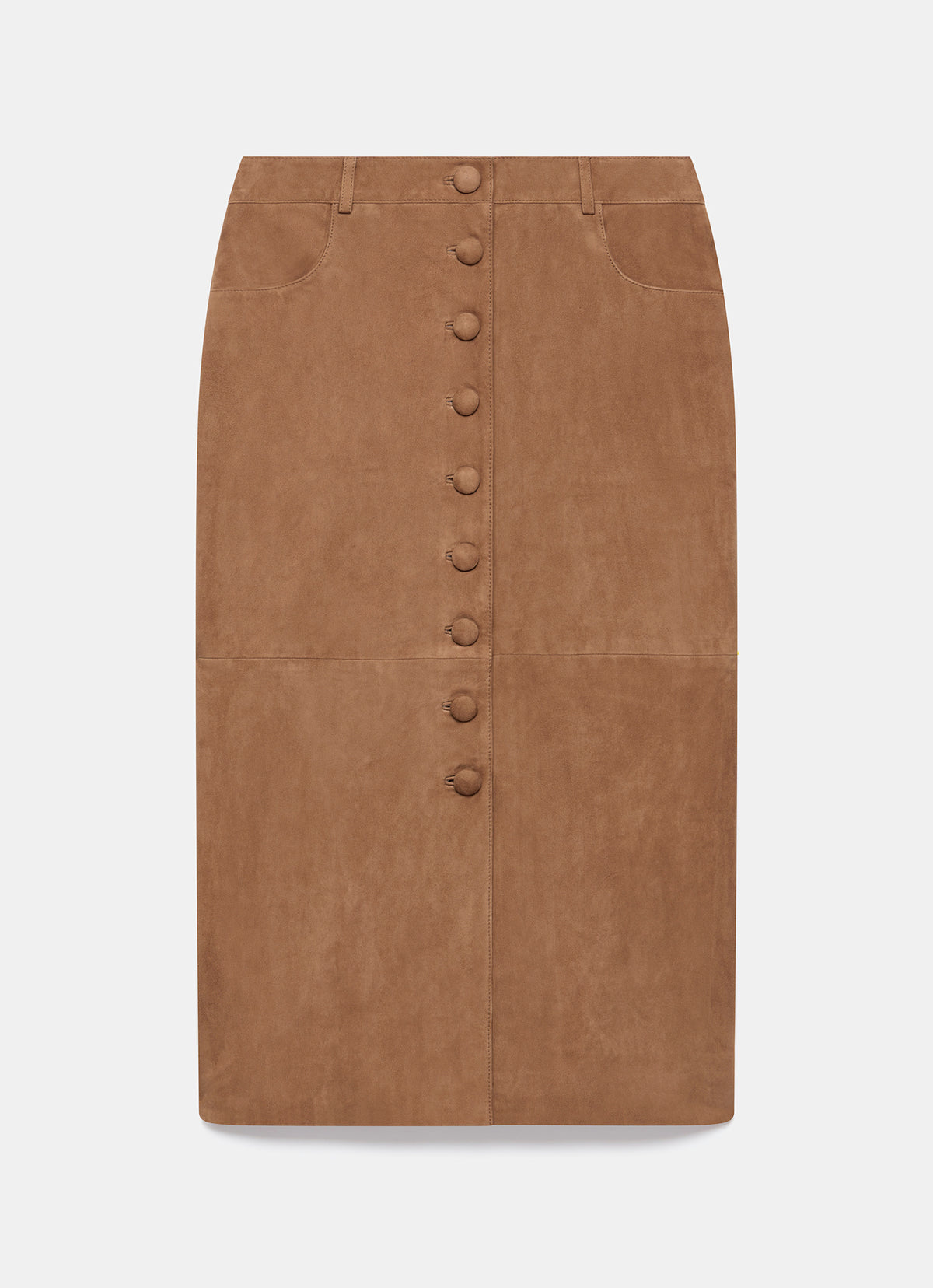 - Tan suede skirt in a midi silhouette featuring belt loops, side pockets, button detailing, rear pockets and a zip fastening through the back.