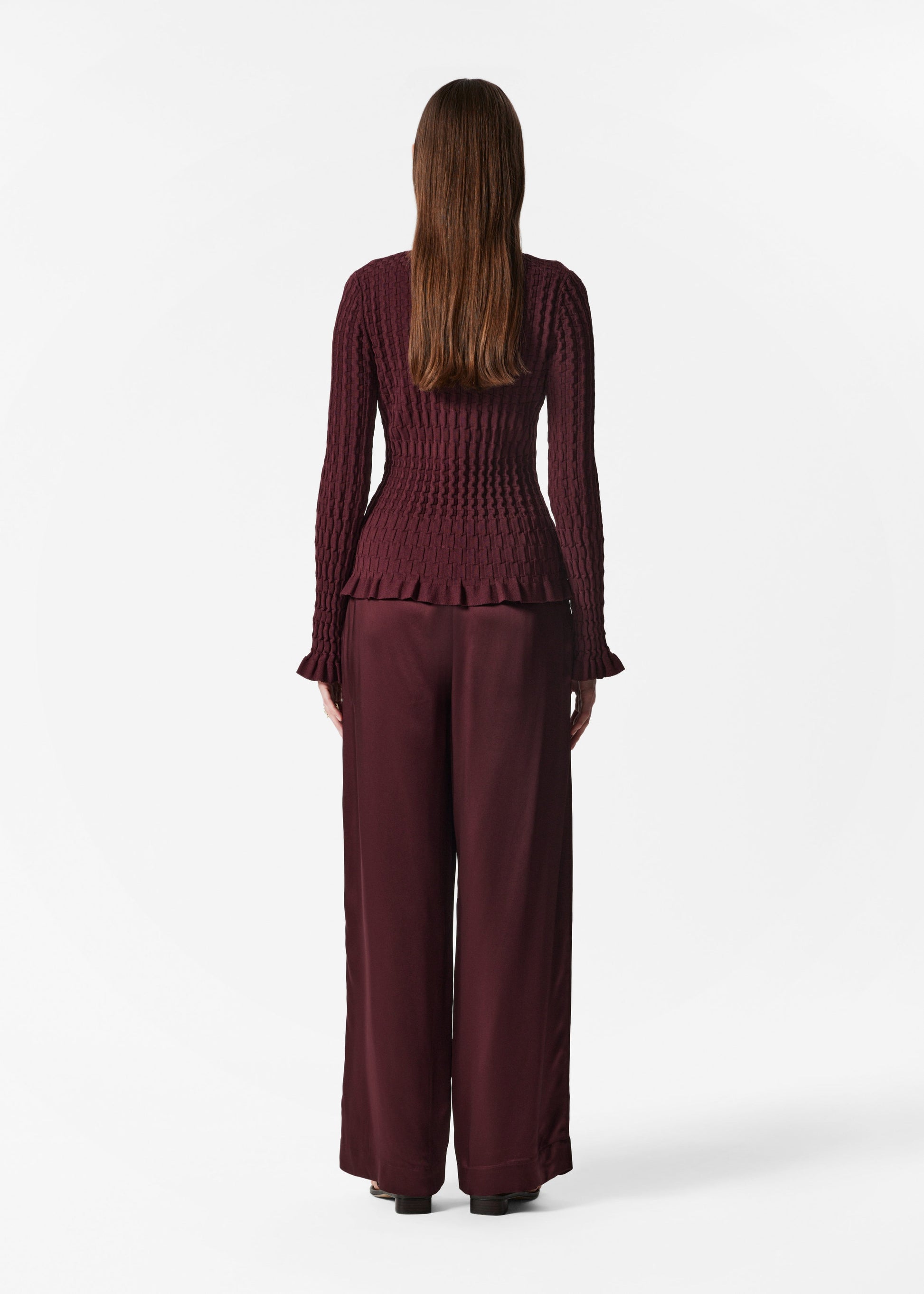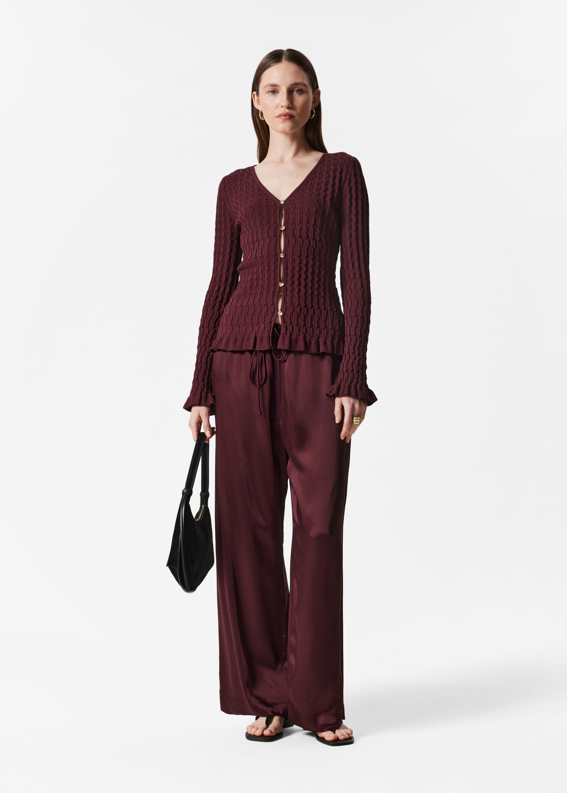 This cardigan is knitted in a structured, basketweave texture. Designed in a fitted silhouette, it features a v-neckline, long fluted sleeves, and flounced edges. A row of gold-toned buttons runs down the front, creating subtle open spaces between closures that offer a glimpse of skin. Wear it as a standalone top or layered over a tank.