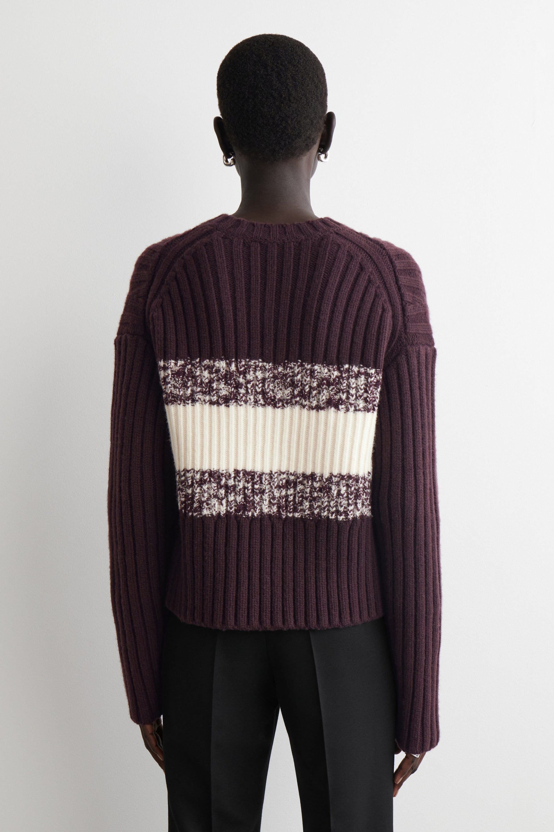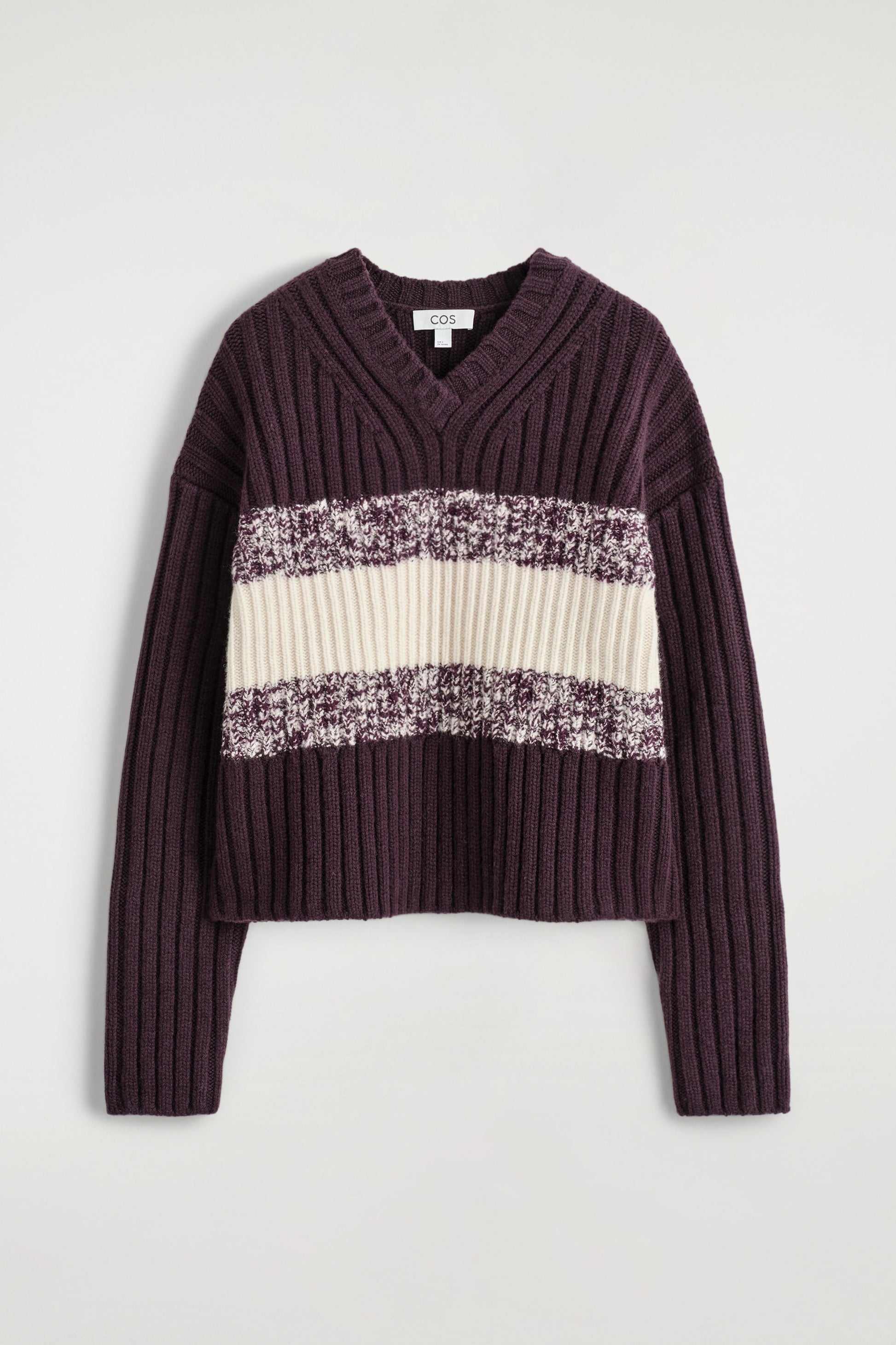 This season, the COS designers renew classic knitwear through rich texture and dynamic pattern. This burgundy V-neck jumper is rib-knitted from premium merino wool and features contrasting cream and mélange stripes across the front.