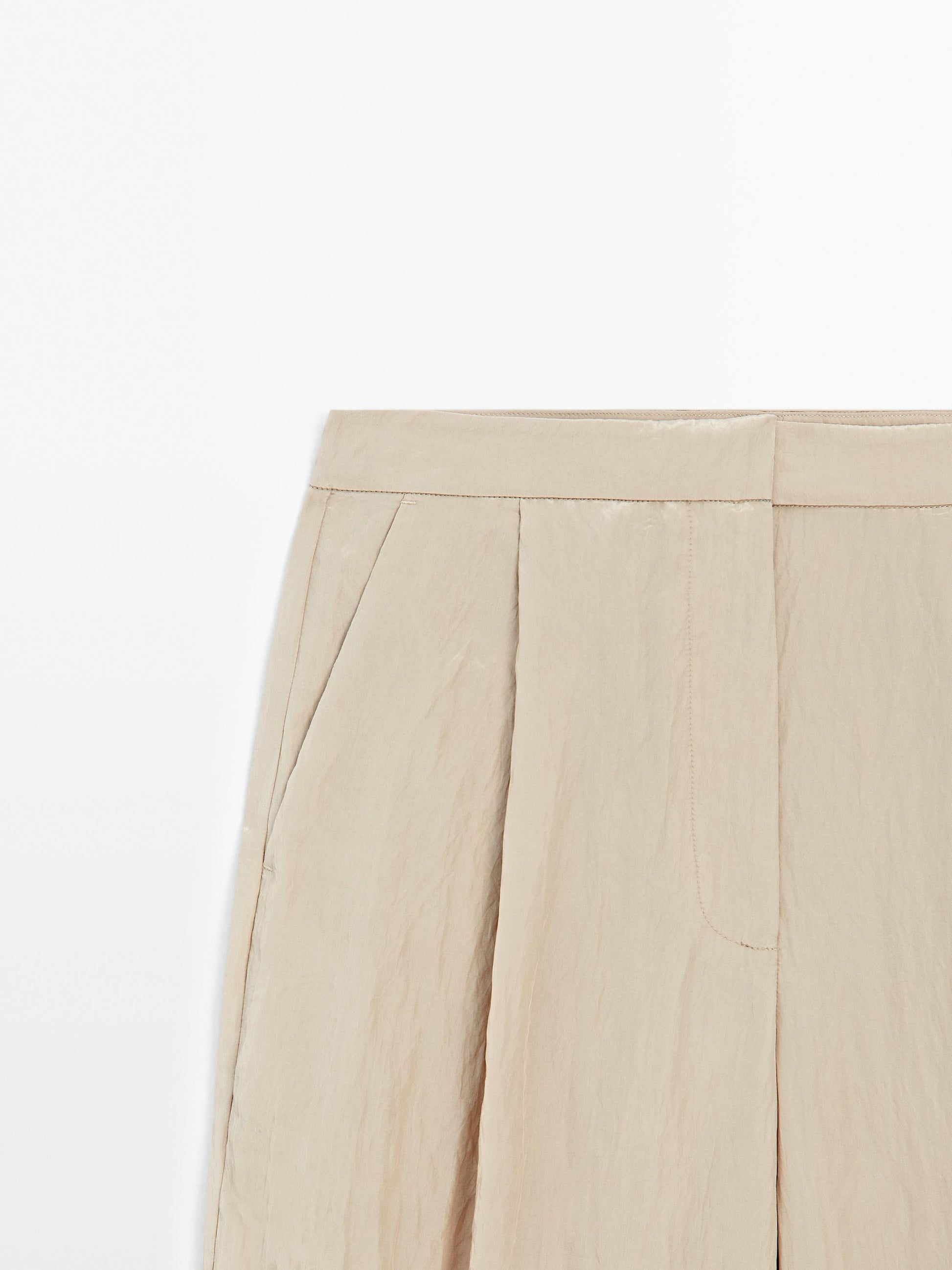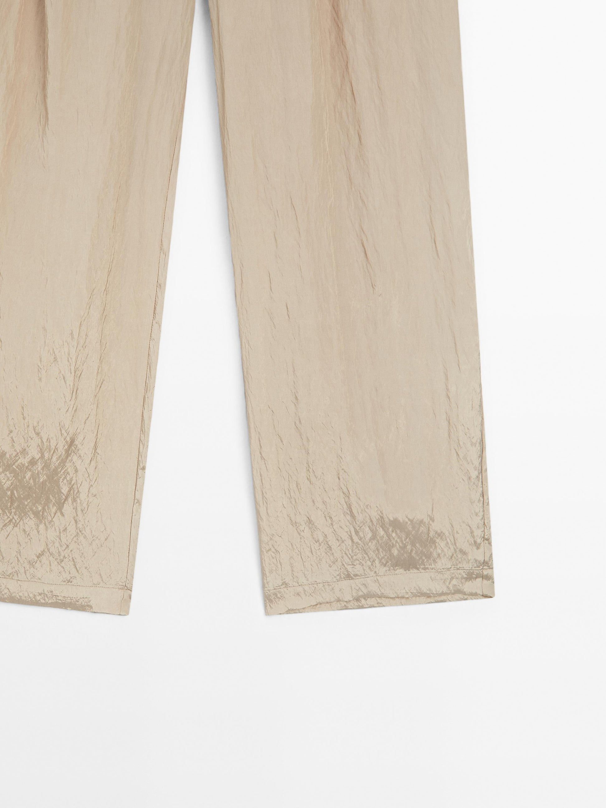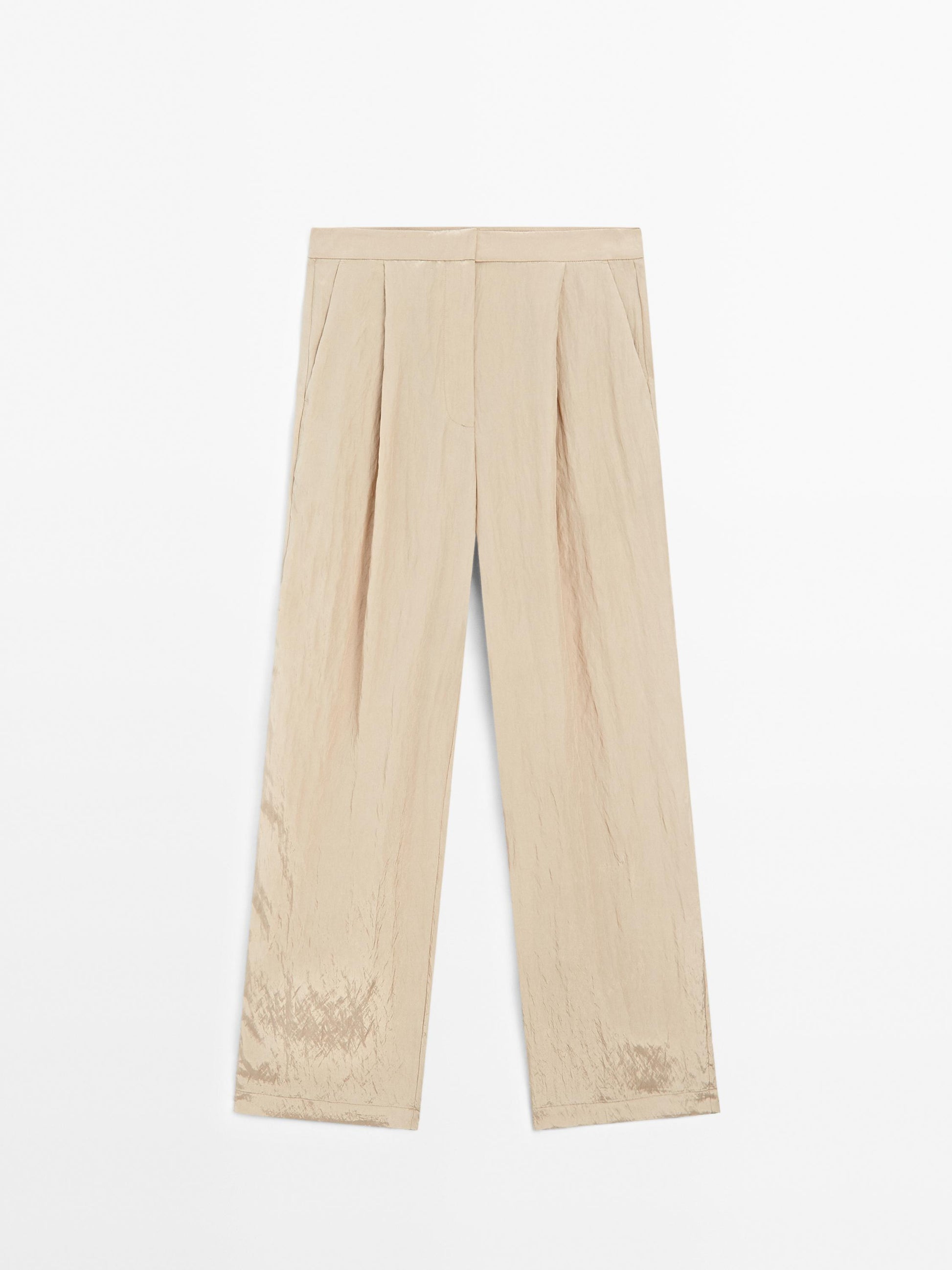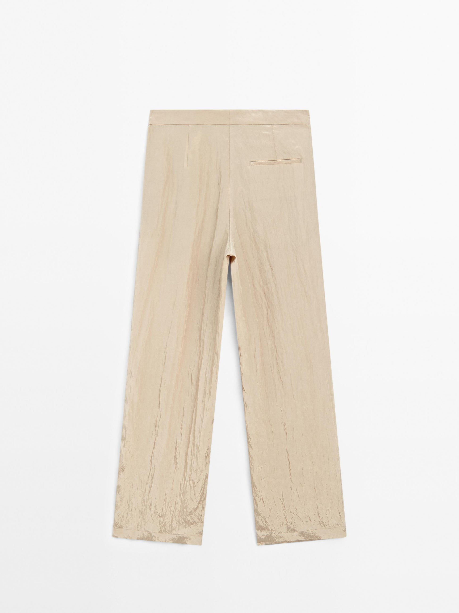 Trousers made of flowing fabric. Mid-waist. Zip fastening concealed by a placket, with hook-and-eye clasp and button. Two side pockets. One welt pocket at the back.