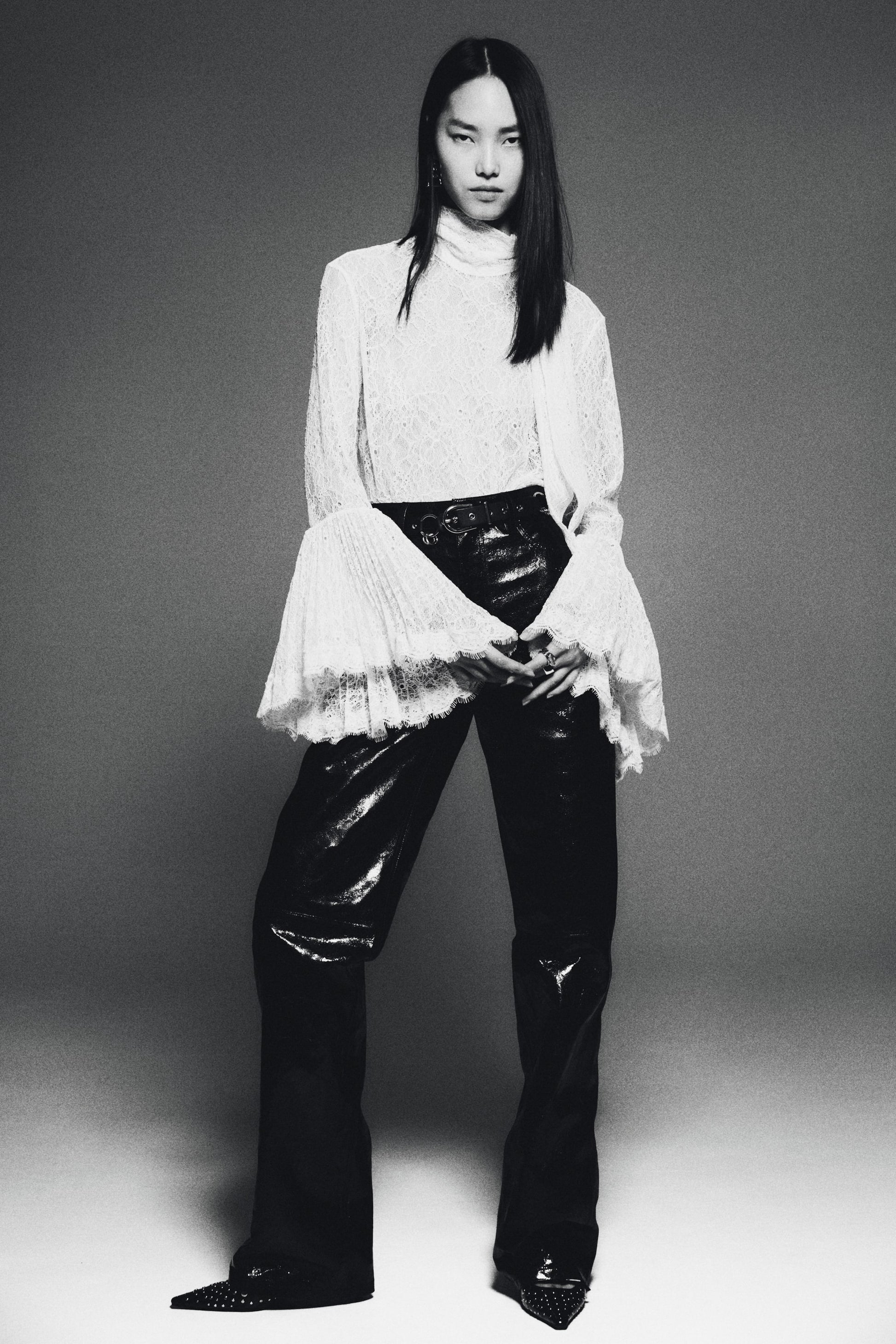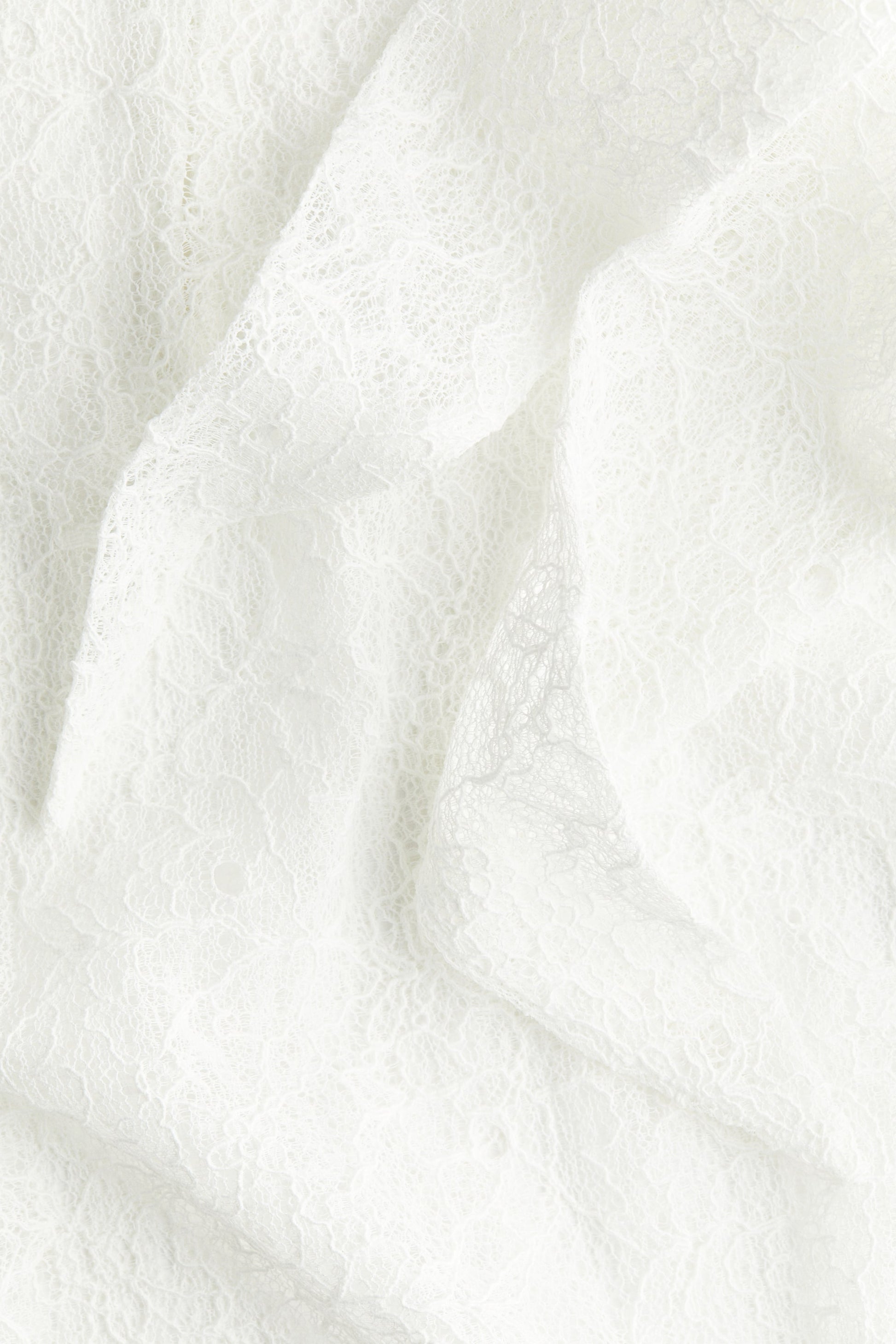 Blouse in sheer lace with a draped stand collar featuring long ties and a keyhole opening with a covered button at the back. Long sleeves with flared, pleated cuffs, finished with a layer of tulle for added volume. Unlined.