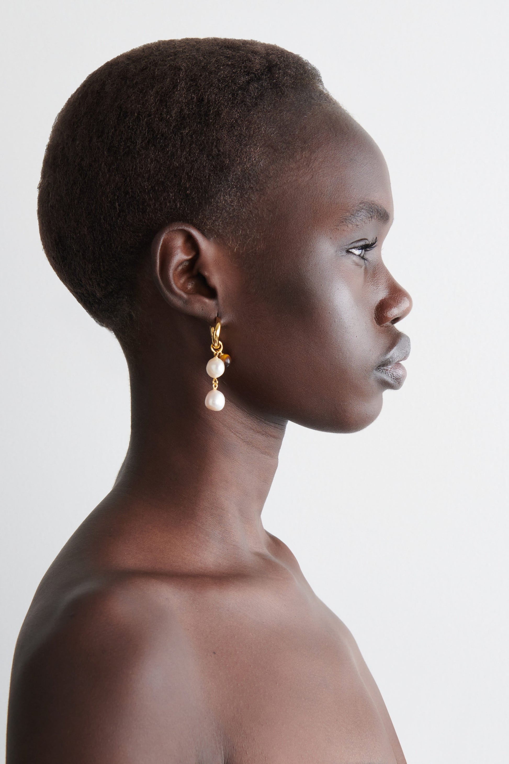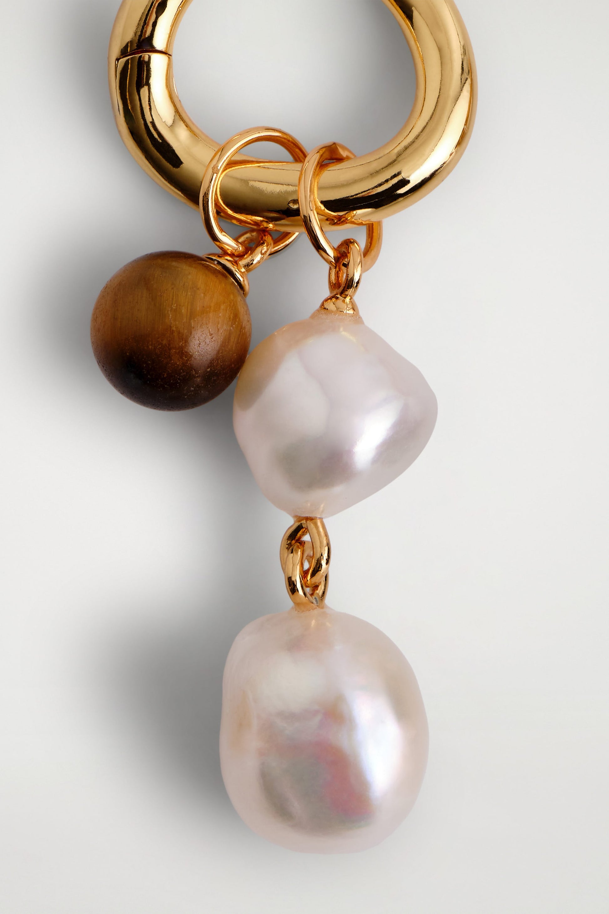 Sculptural jewellery has the transformative power to elevate any outfit. Intentionally mismatched, these striking hoops are crafted in an artfully twisted shape with exquisite charms dropping from each piece – baroque freshwater pearls, tiger's eye and a glossy onyx teardrop.