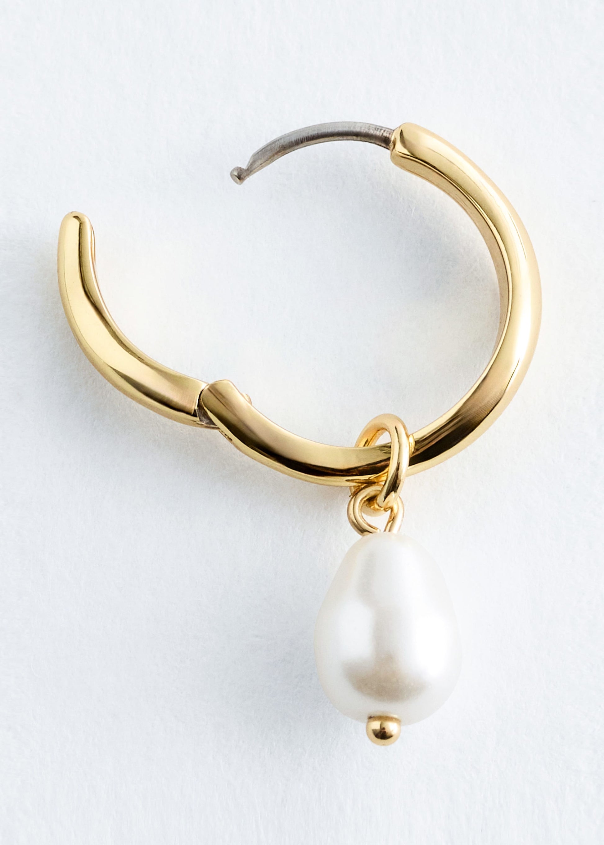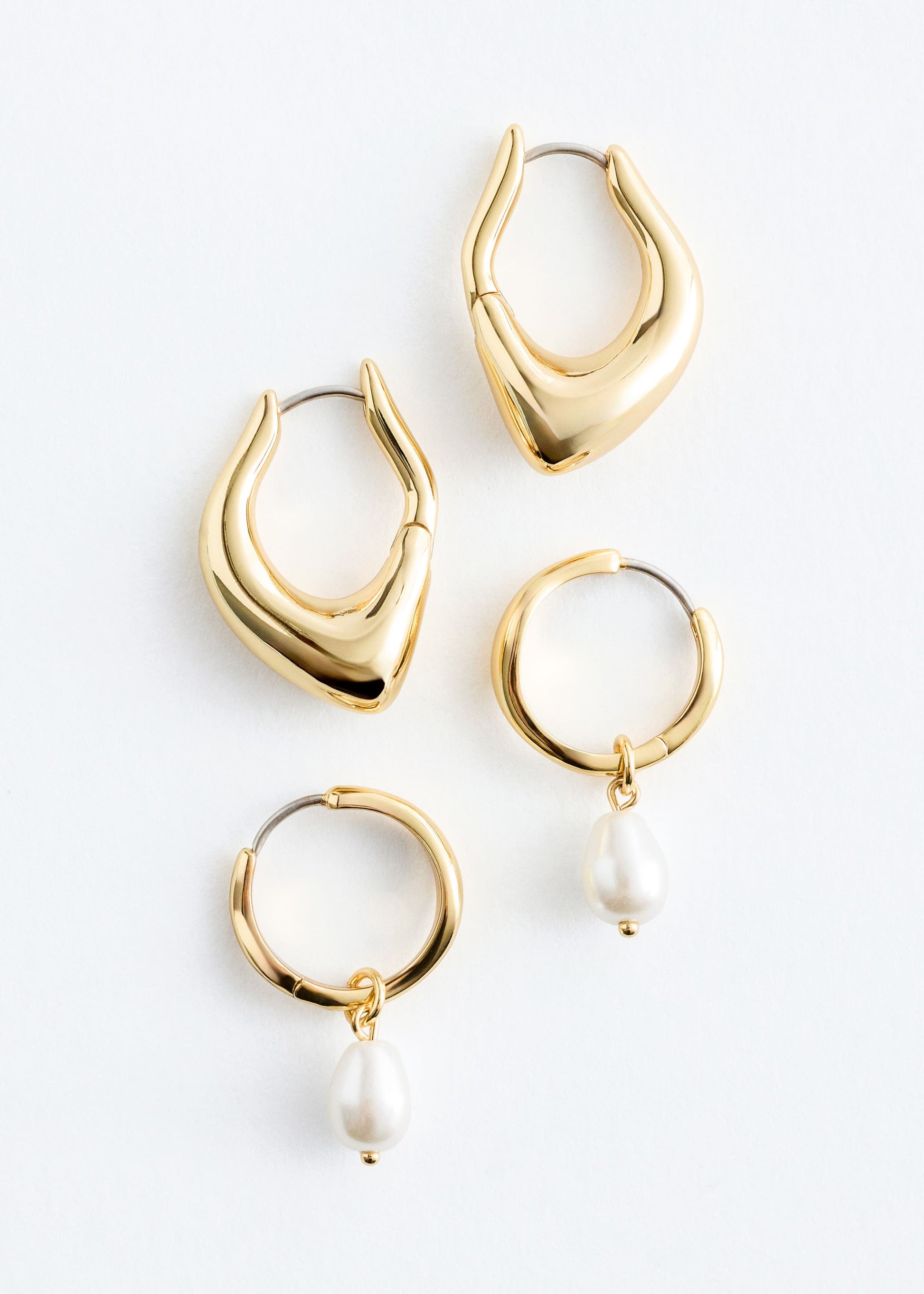 Crafted from polished brass, this two-piece earring set consist of one pair of irregular, chunky hoops and one pair of slim hoop earrings adorned with a pearl stone pendant. Both pairs feature a hinge closure.