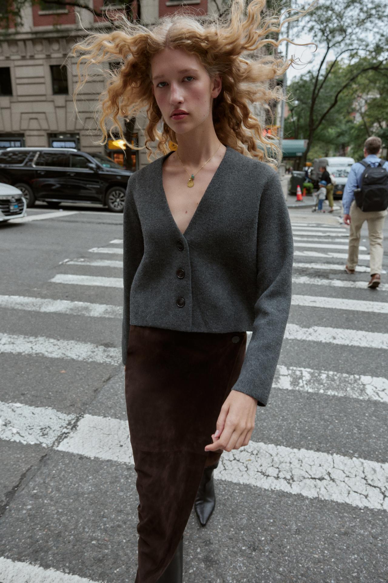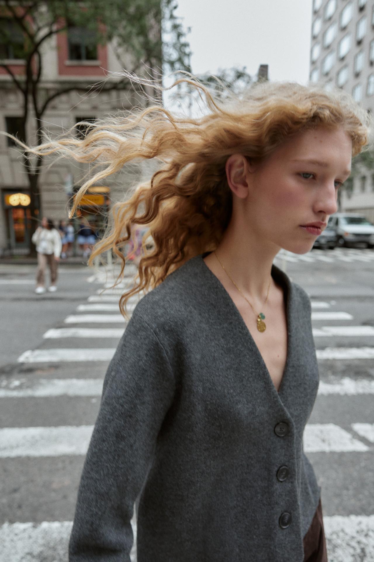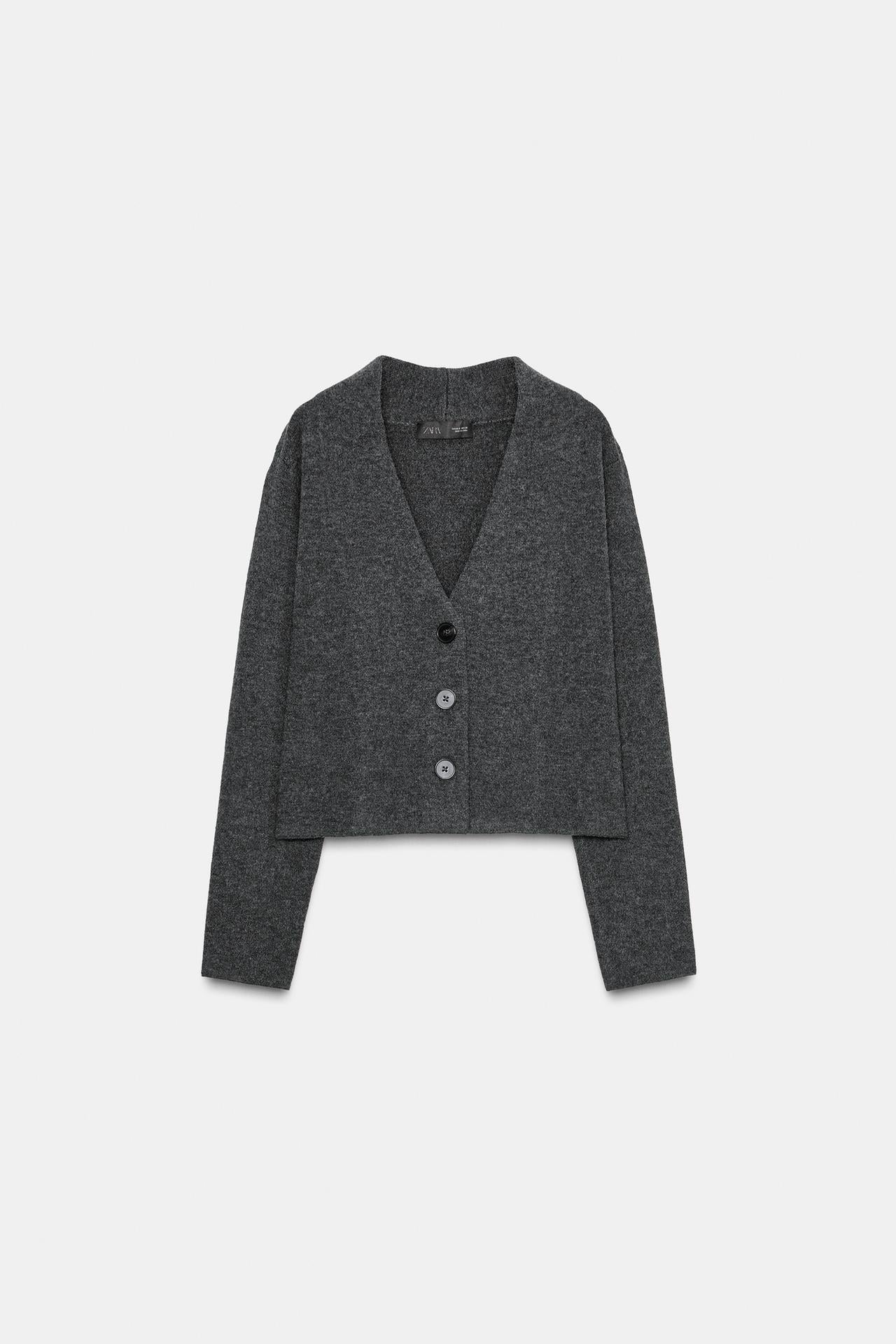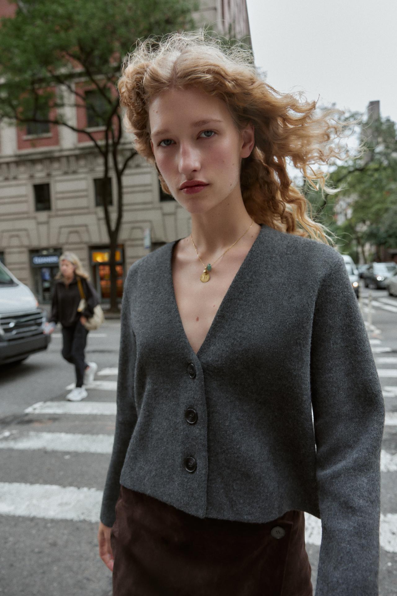 V-neck cardigan with long sleeves. Front button fastening.