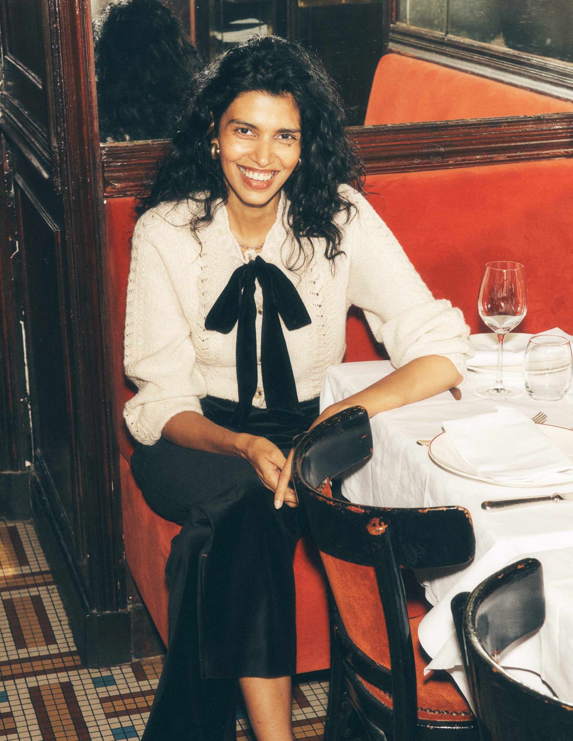 We took a classic cotton and wool blend cable knit cardigan and added a touch of romance. The chevron trim and pointelle detail, topped off with a velvet bow make this style the one you'll fall in love with.