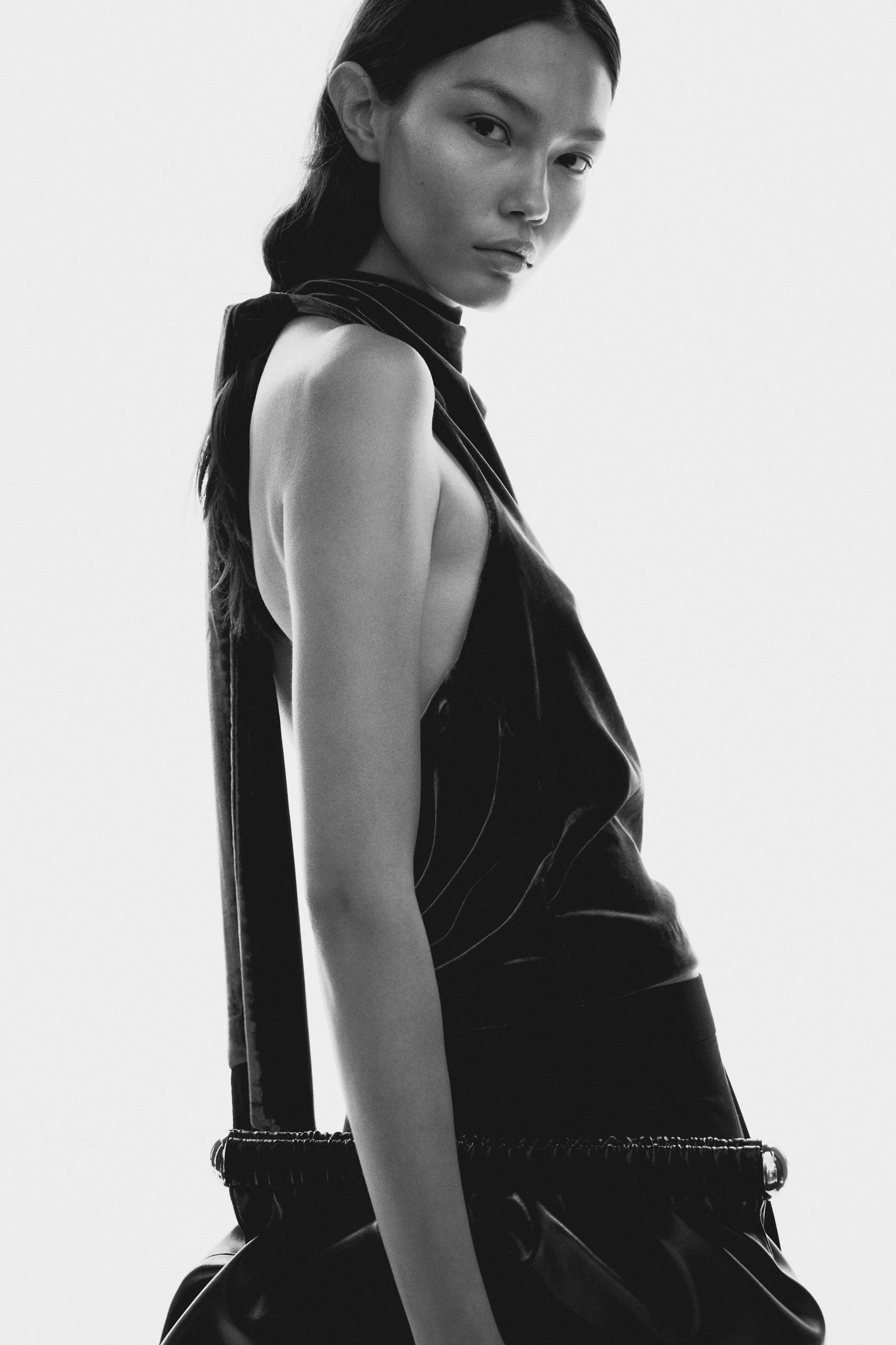 Sleeveless top in soft velvet with a cowl neckline and wide halterneck ties with long fringes. Concealed zip and hook-and-eye fastener at one side.