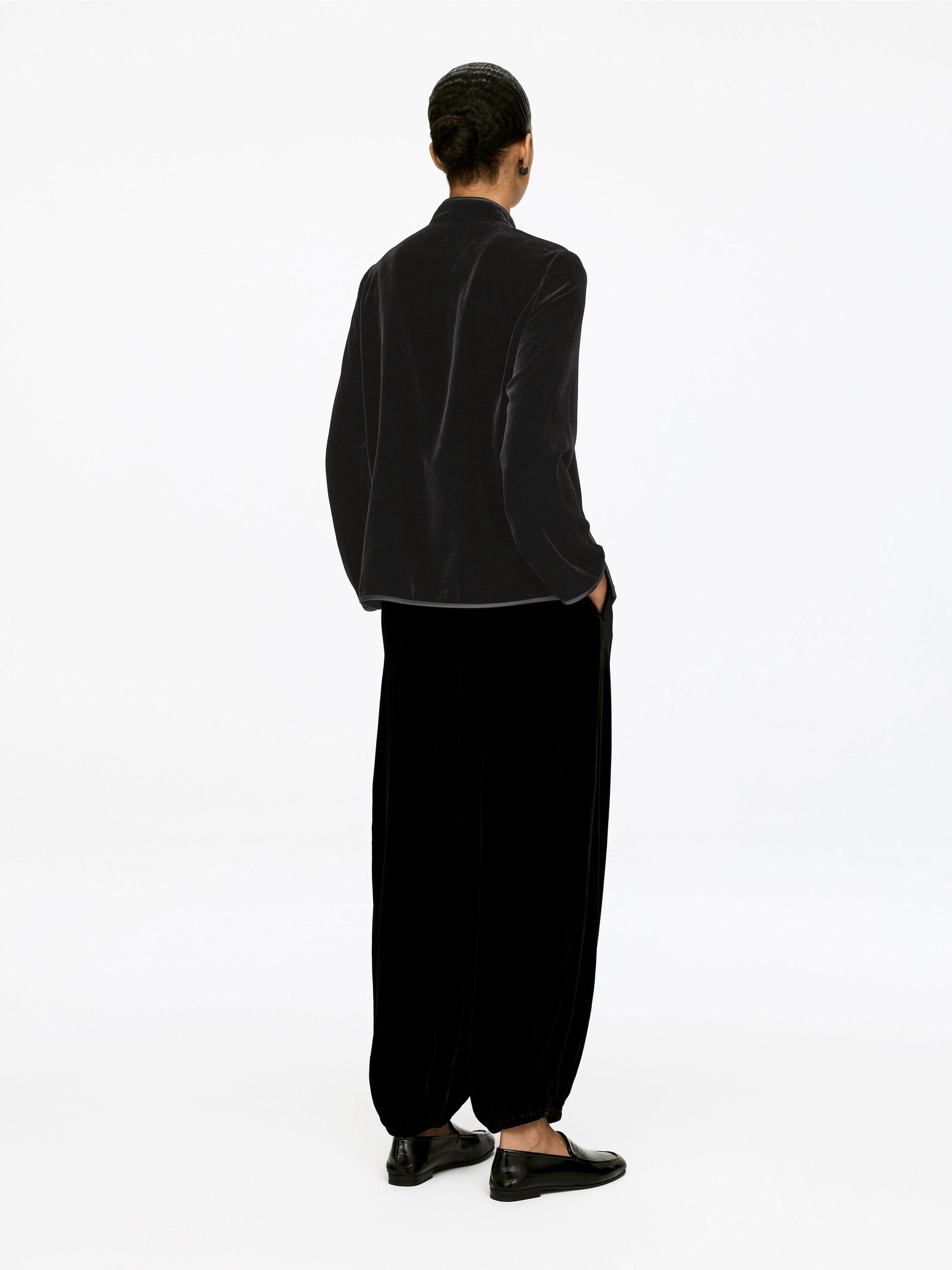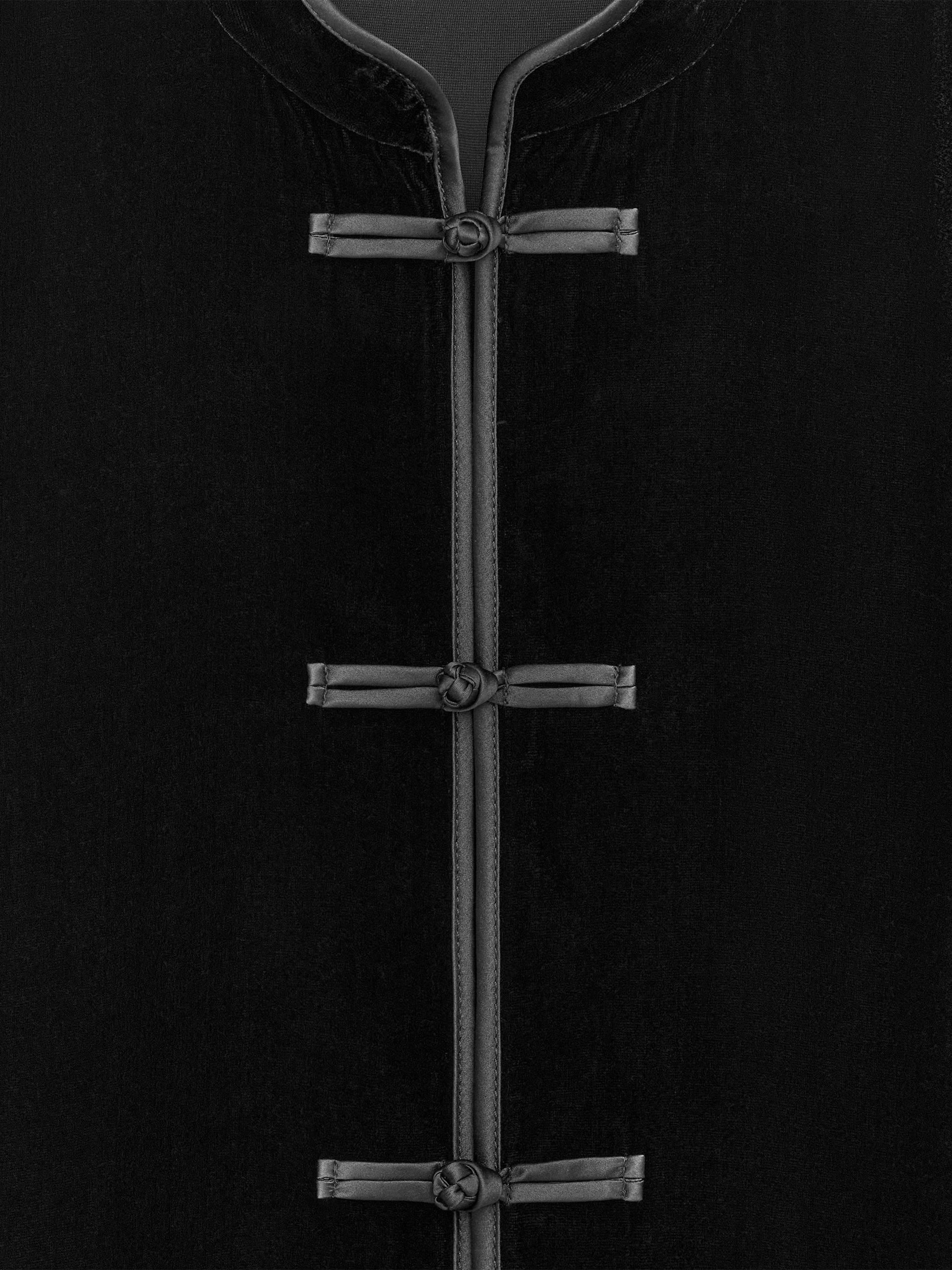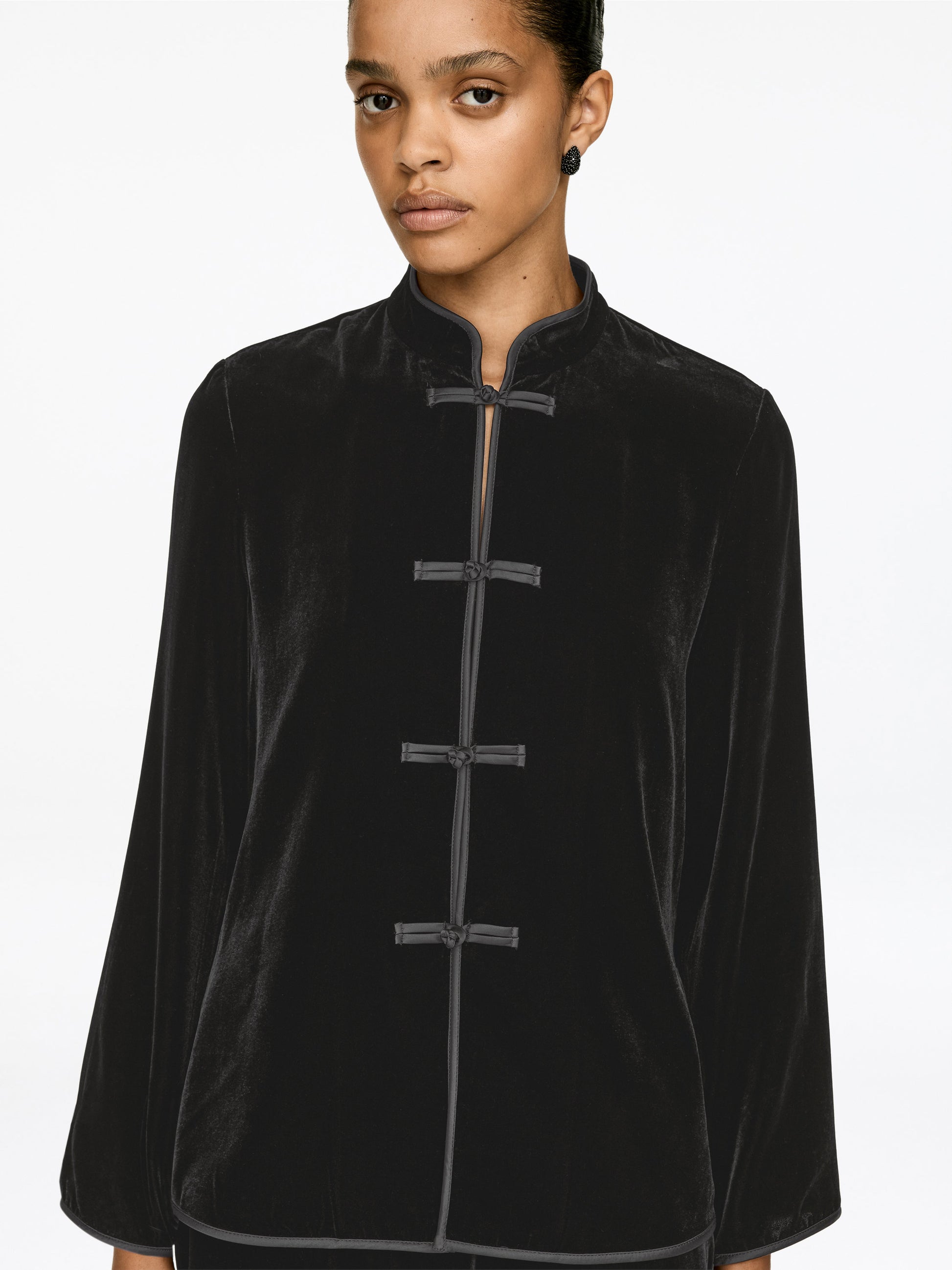 Velvet overshirt crafted from a viscose and silk blend. Features velvet strap fastenings with knots.