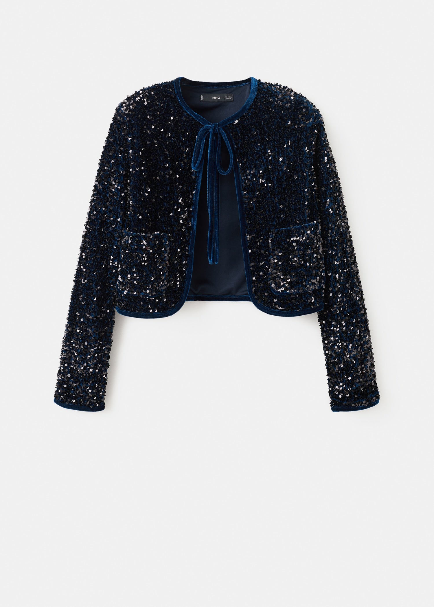Velvet fabric. Fabric with sequin. Crop design. Straight Design. Round neck. Long sleeves. Two front patch pockets. Bow fastening on the neck. Inner lining. Total look. This garment is part of our party and event collection, designed to elevate your looks for special occasions.