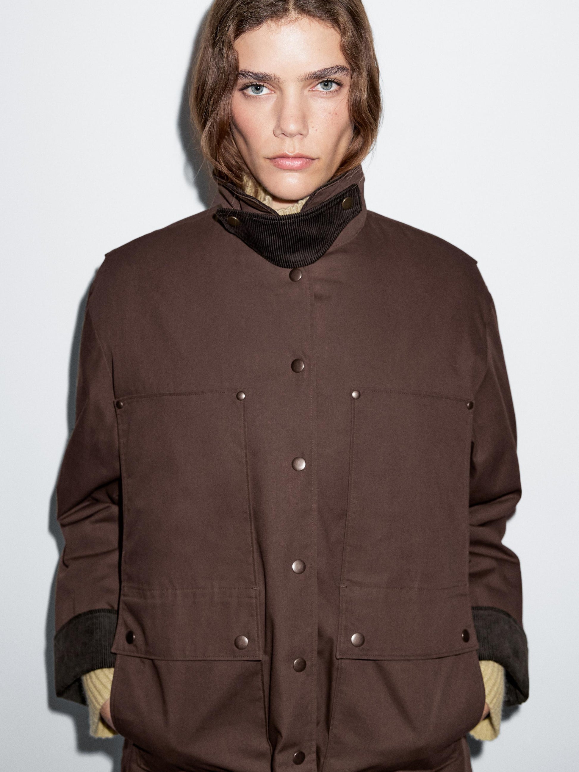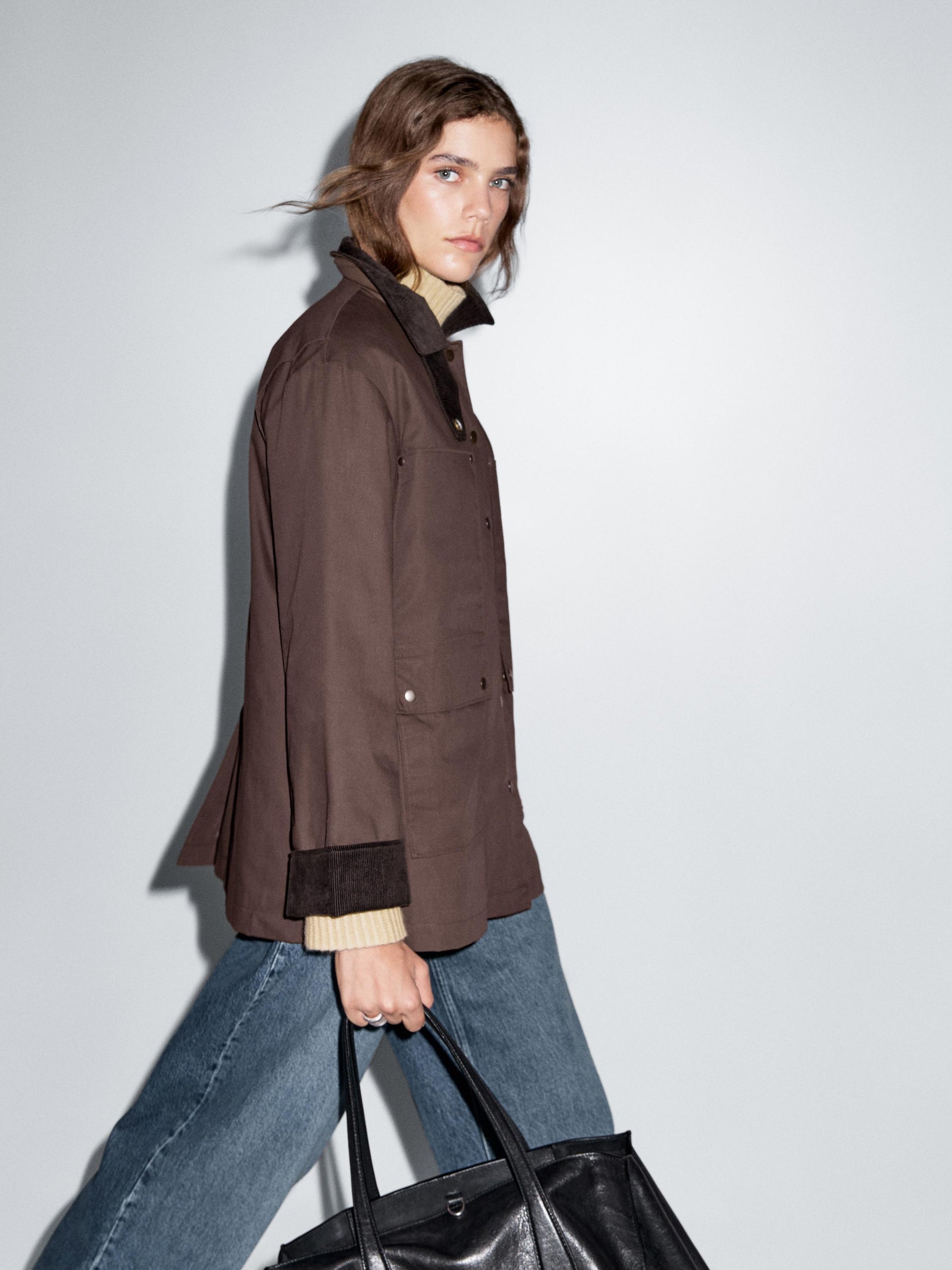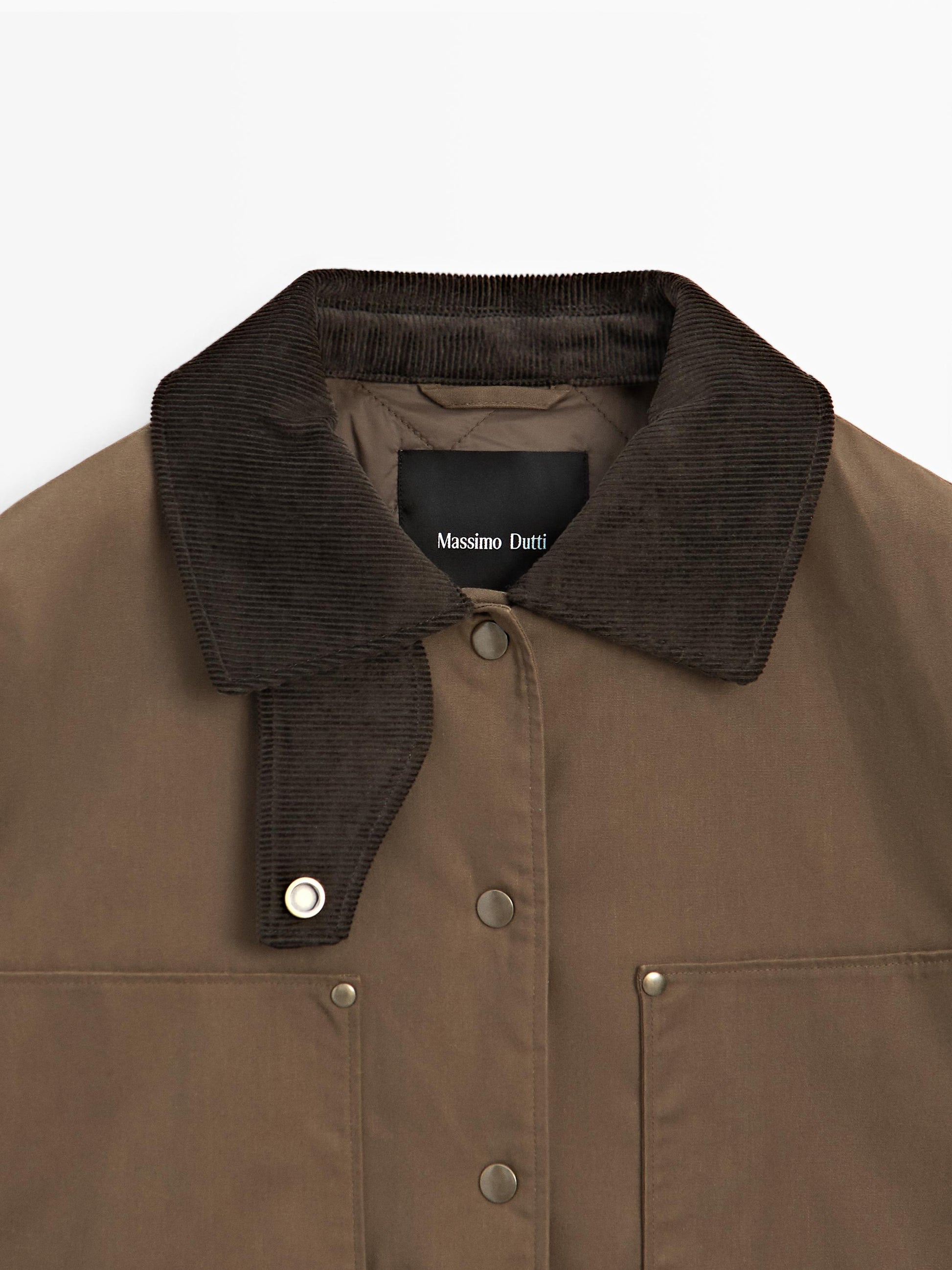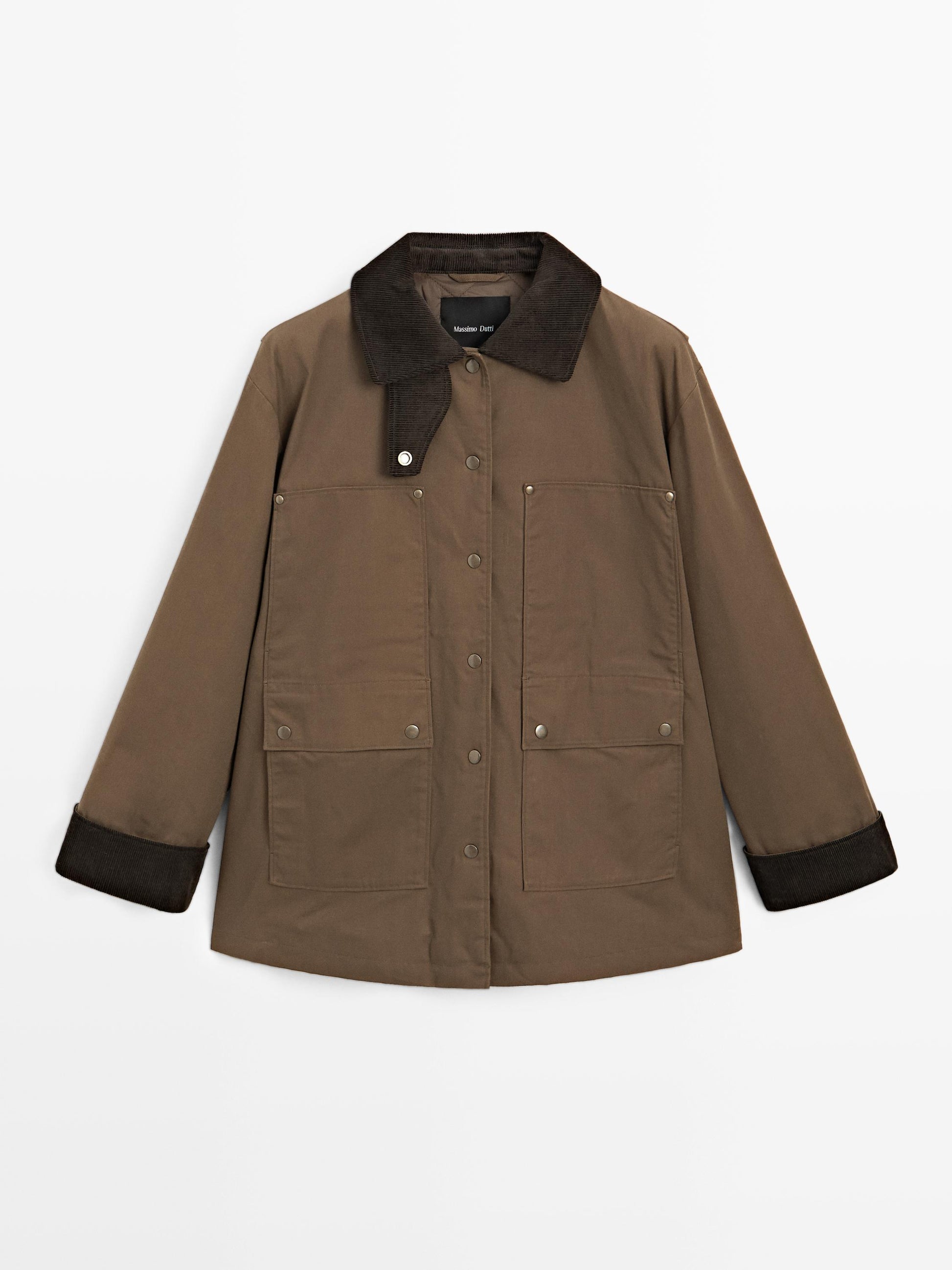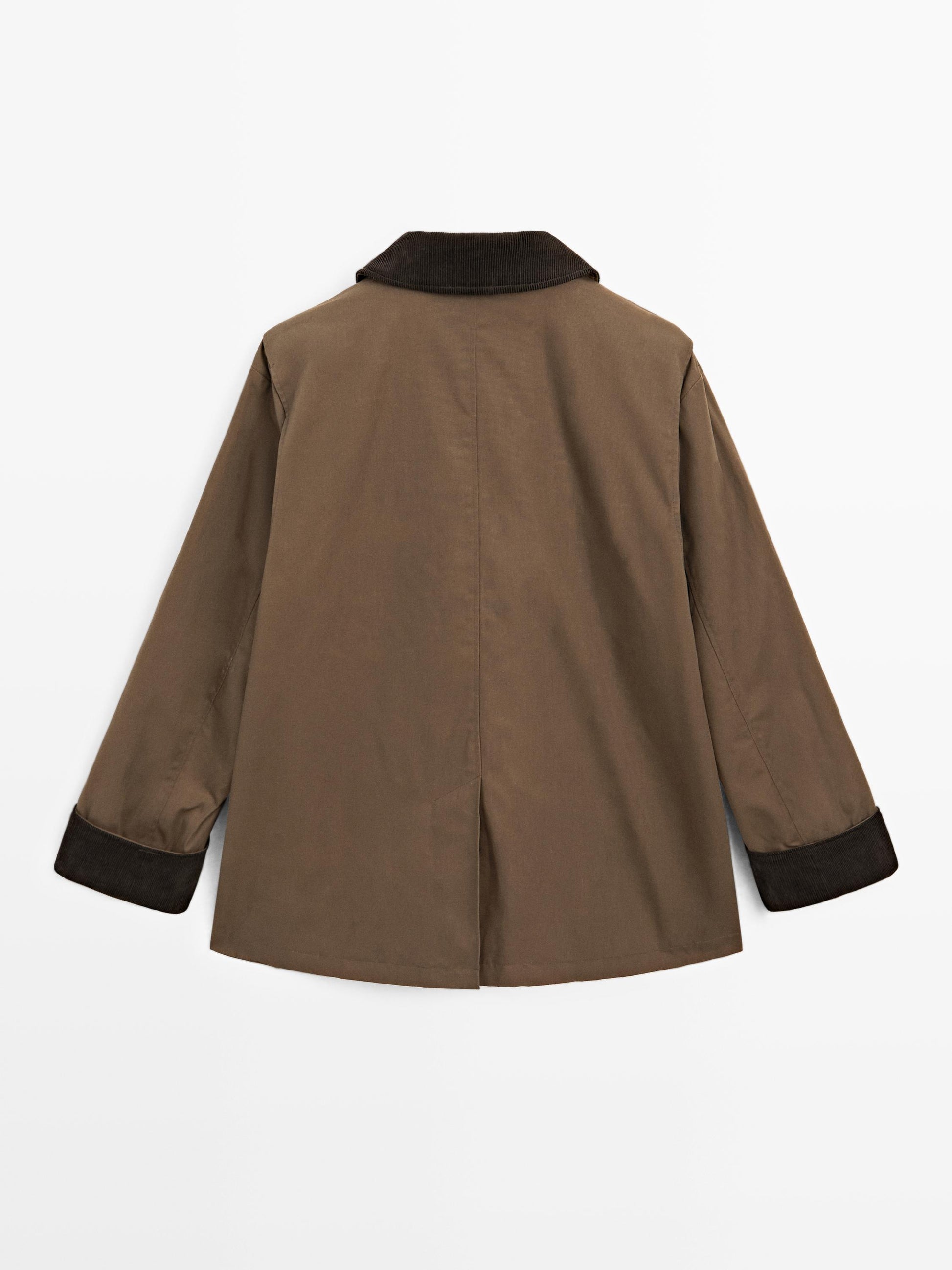 Parka. Parka made of a cotton blend. Collar with buttoned tab. Waxed finish . Snap button fastening. Two side pockets. Two flap pockets. Corduroy fabric detail on collar and cuffs . Central back opening.