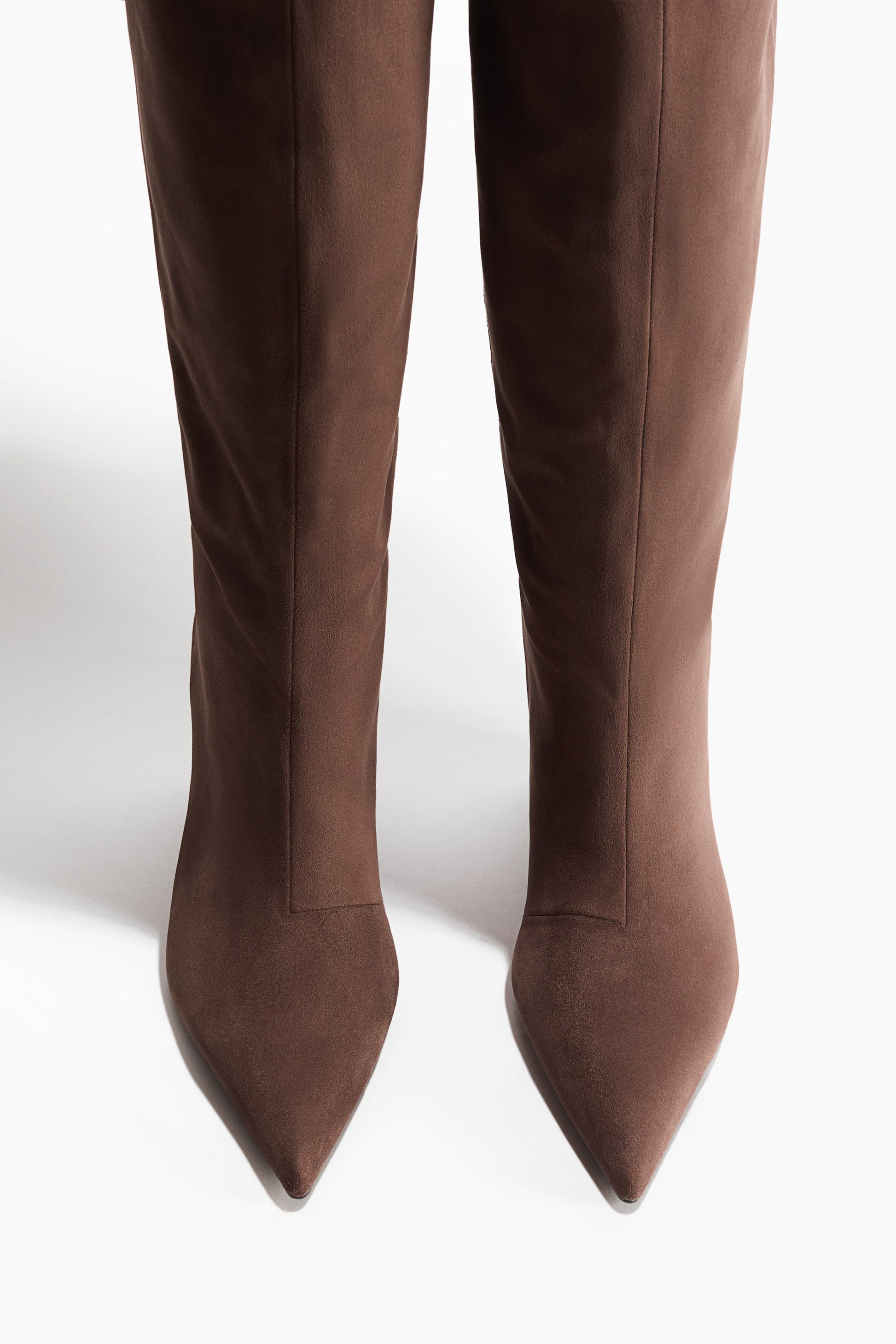Over-the-knee boots with a soft, napped finish featuring pointed toes and wedge heels. Jersey linings and insoles.
