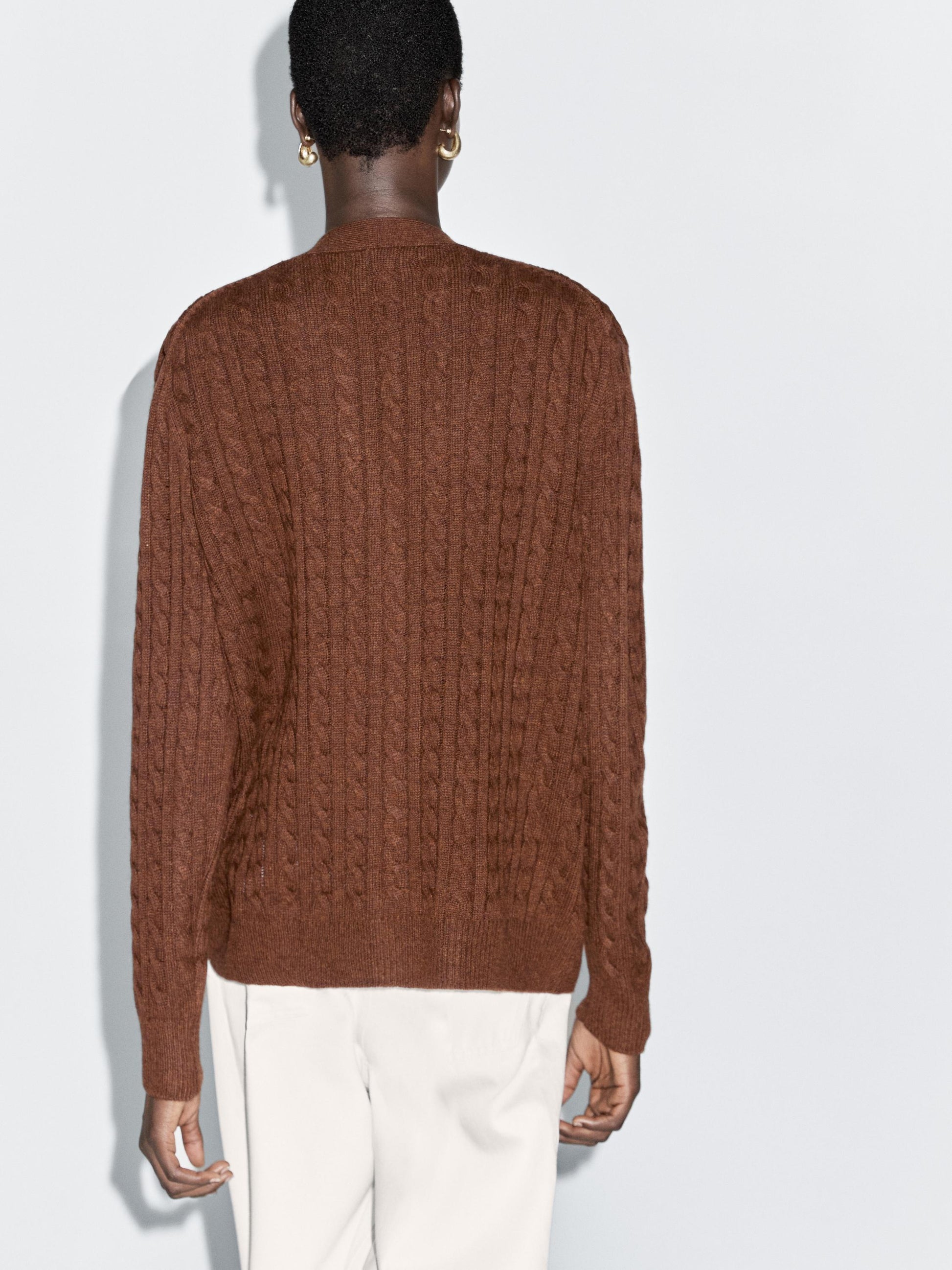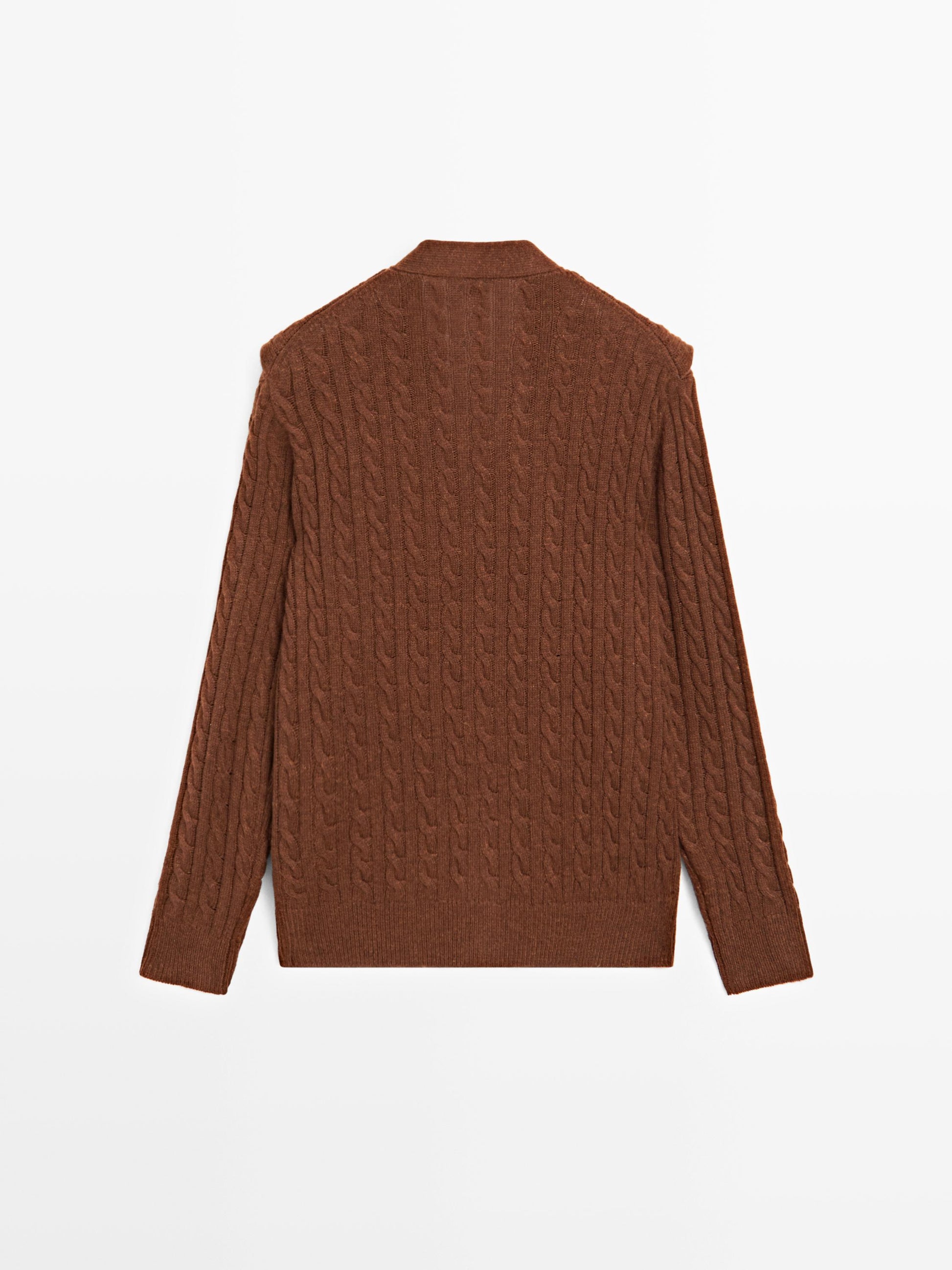 Cardigan made of knit fabric with wool . V-neck. Long sleeves. Button-up front. Scarf detail at the neck . Braided detail.