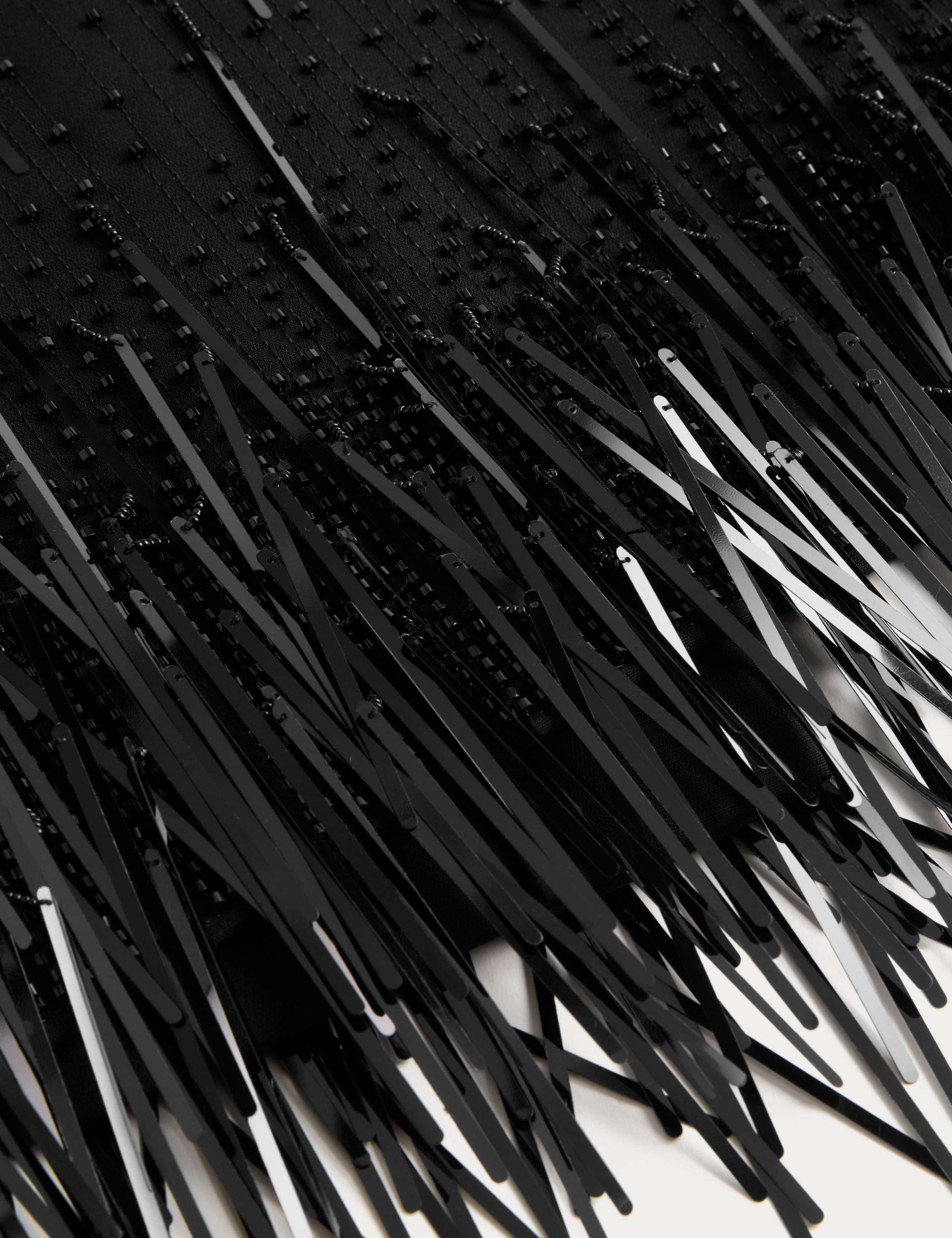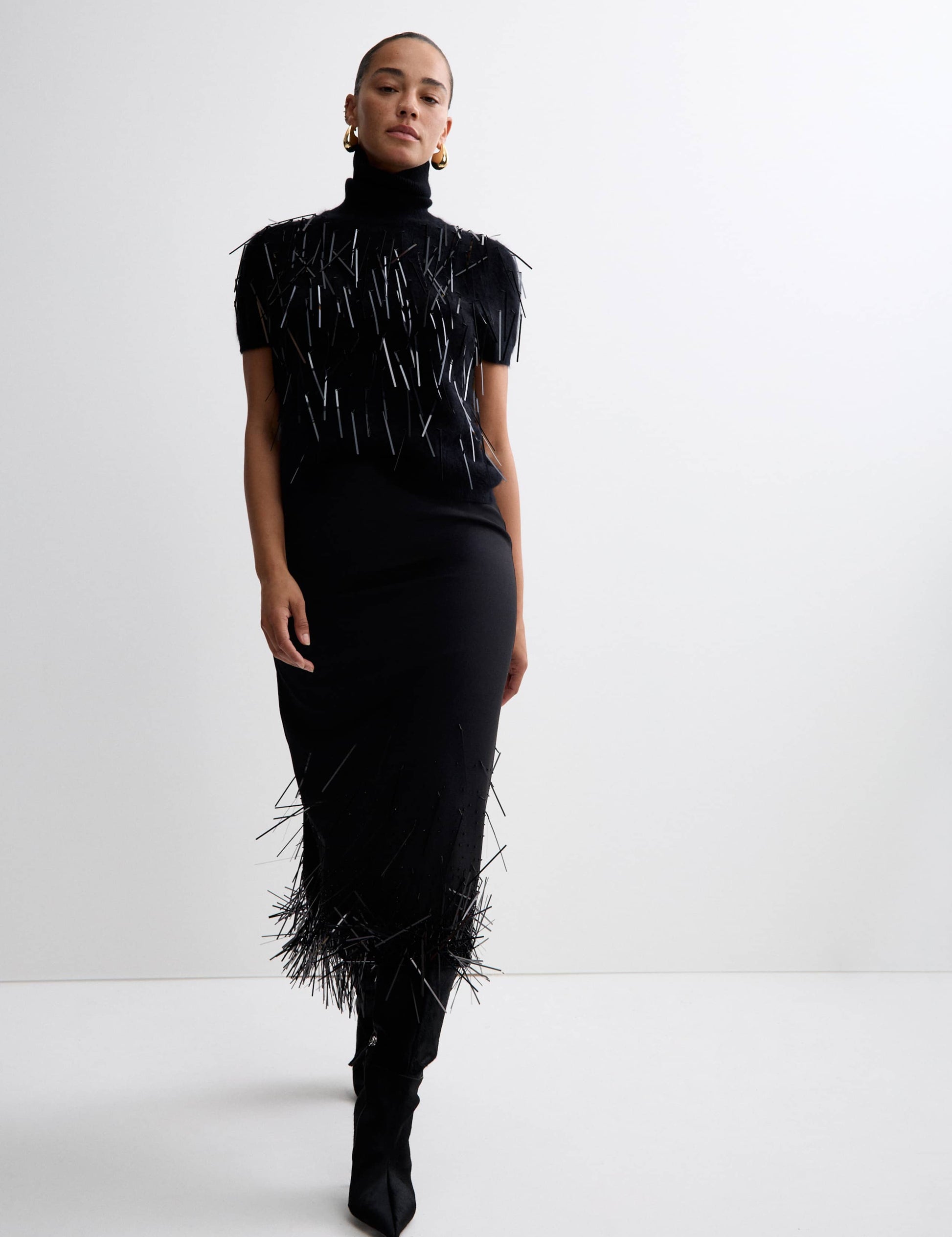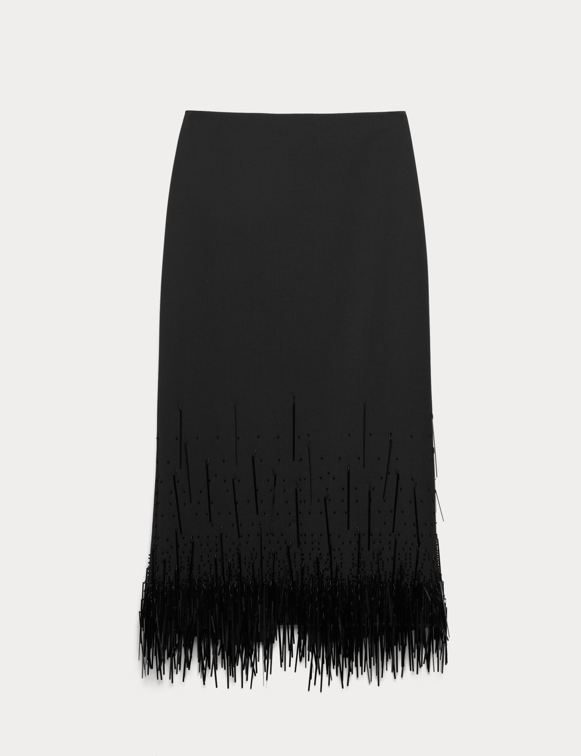 This wool-blend midi skirt from our M&S x 16Arlington collaboration is a typical style of the luxury fashion house, balancing sharp tailoring with playful embellishment. The regular-fit column silhouette is bolstered by hand-applied sequins and beads at the tasselled hem, bringing shimmer and movement to every step. Wear it when the dress code demands glamour.