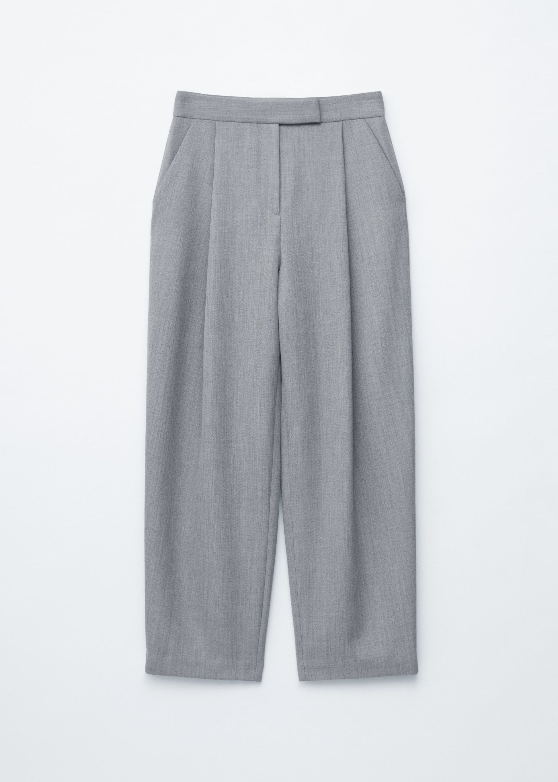 Tailored from a wool blend, these trousers are cut in a loose silhouette with full-length legs, accented by front pleats and pressed creases at the back. They feature slanted side pockets, welt back pockets, and an extended waistband with a zip fly and a hook-and-bar and button closure.
