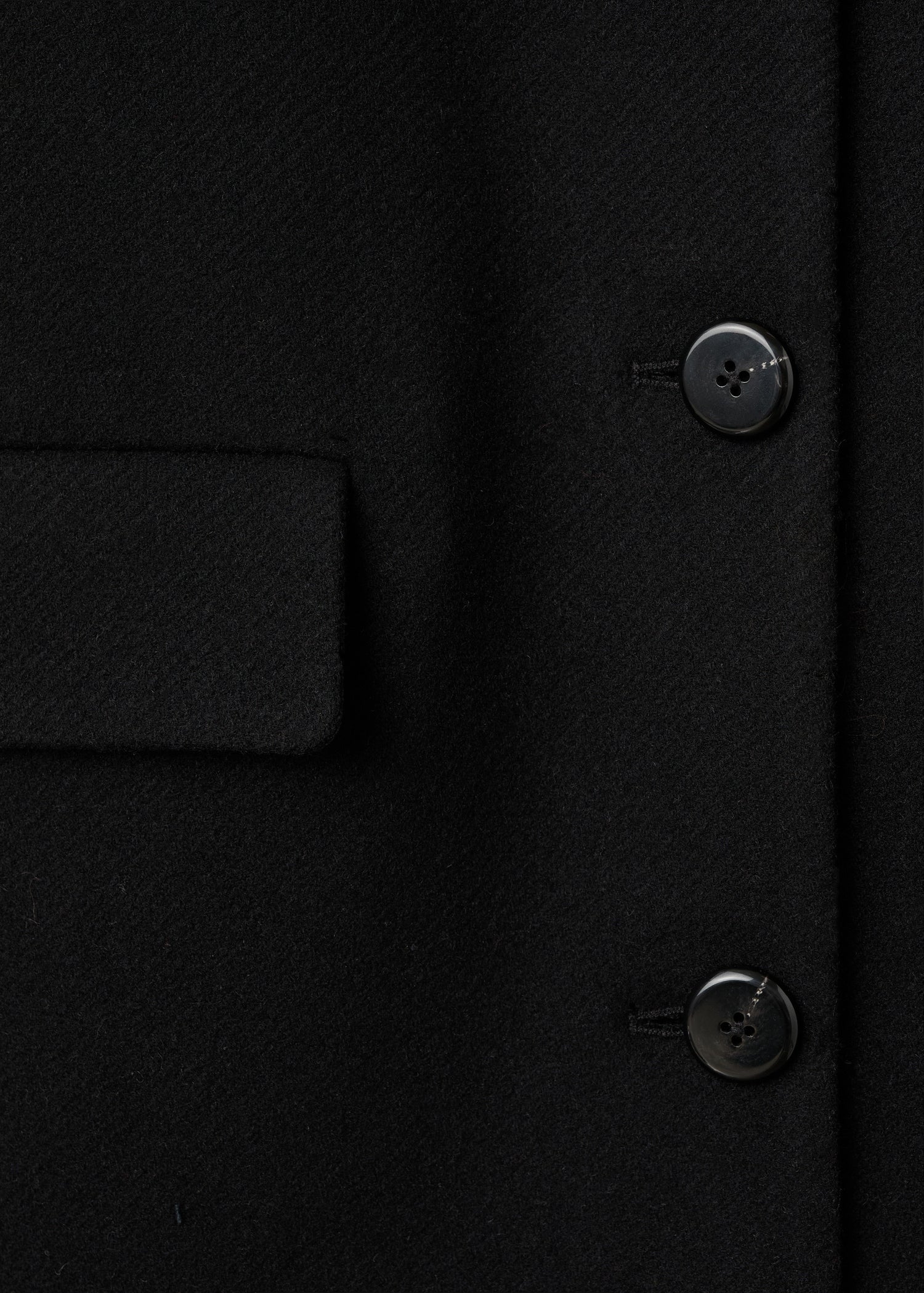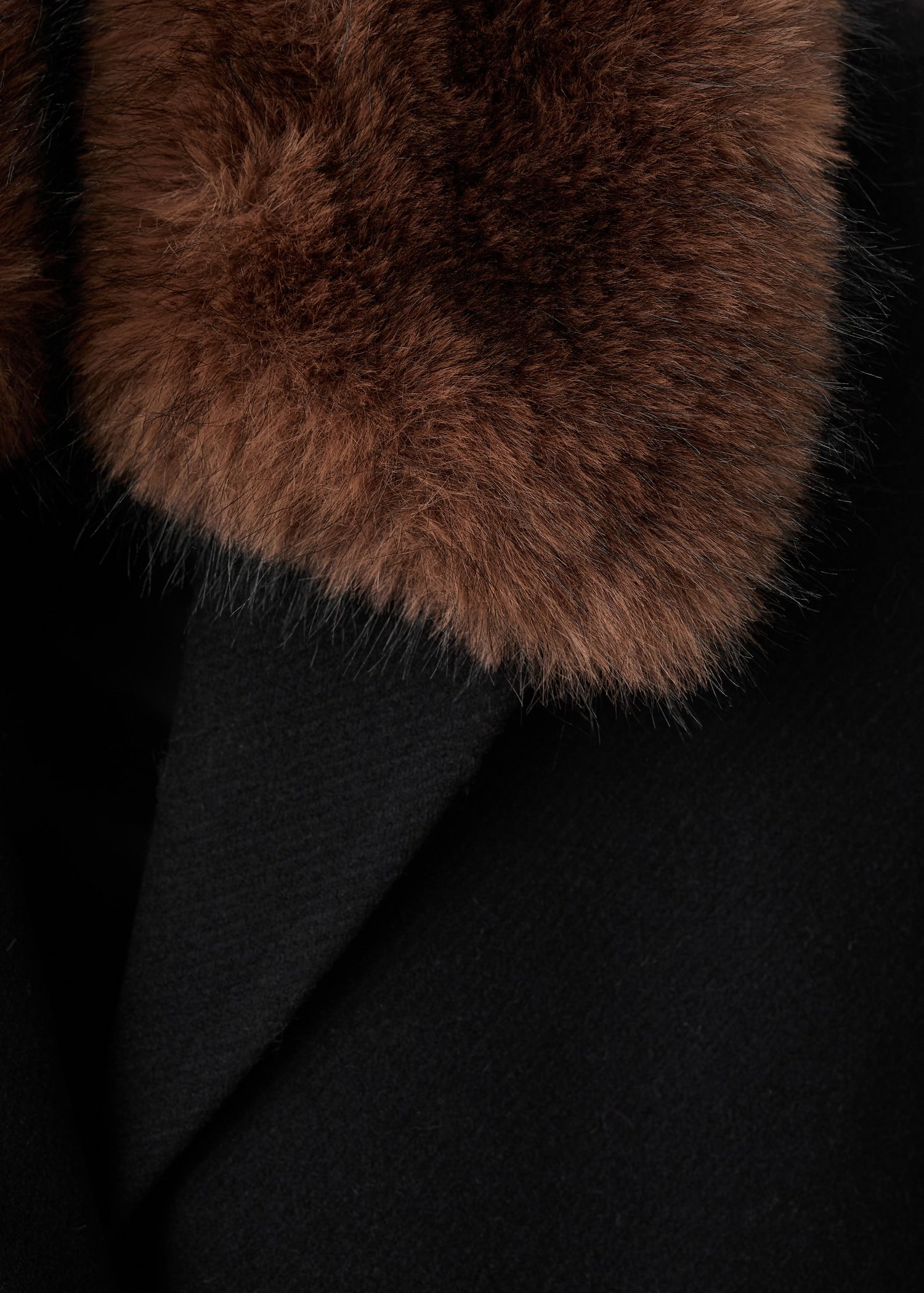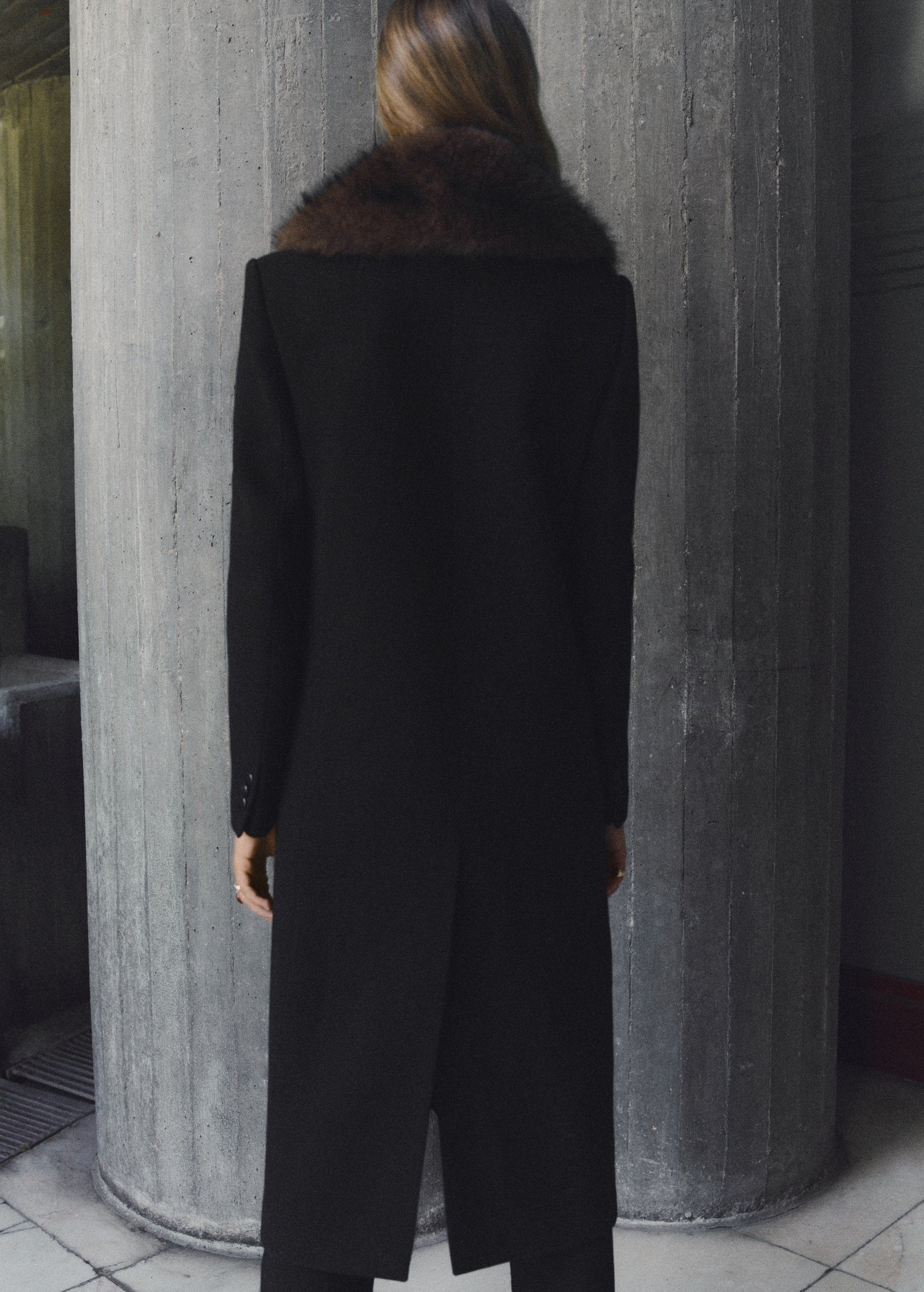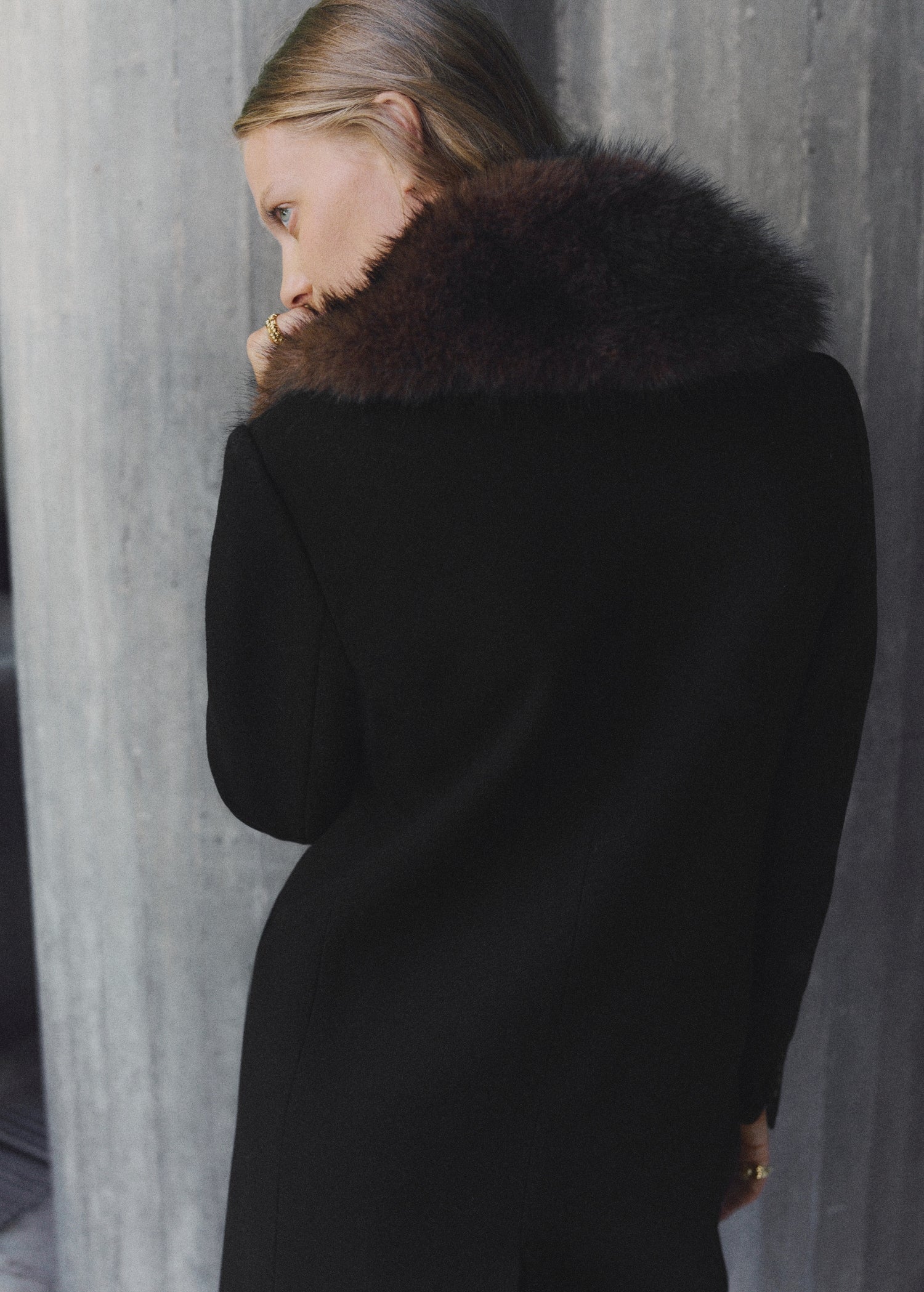 Wool mix fabric. Long design. Straight Design. Lapel-collar V-neck collar. Detachable fur-effect collar. Long sleeves with buttoned cuffs. Two pockets with flaps on the front. Front closure with buttons. Inner lining.