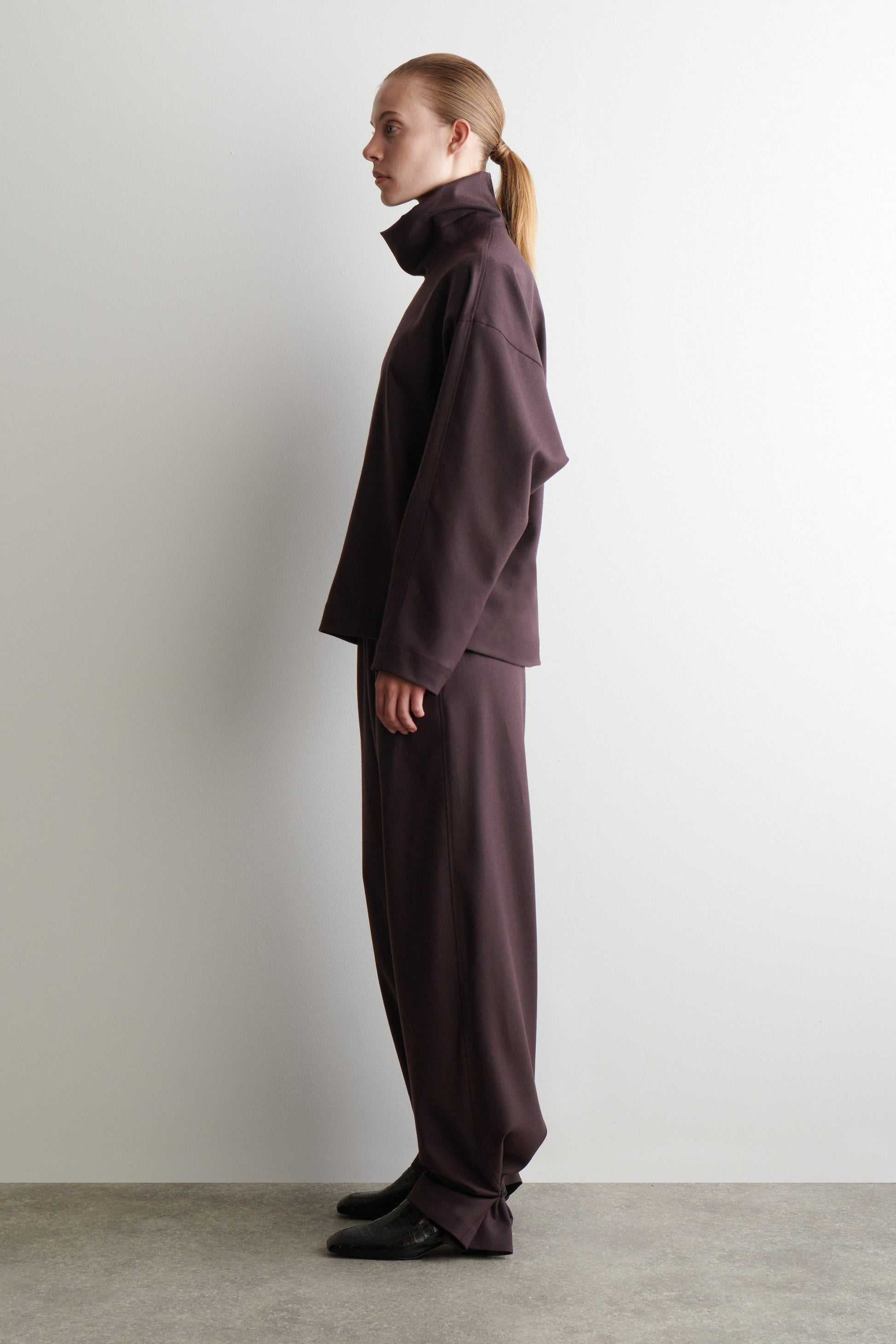 Autumn Winter 2025 takes the modern wardrobe to new heights: the epitome of quiet confidence. Proposing a distilled take on shirting, this refined piece is crafted from premium wool-flannel sourced from the esteemed Marzotto mill. It's cut in a softly cocooning silhouette and features a draped funnel neckline that creates an asymmetric shape when unbuttoned. Style it with the matching trousers for a tonal look.