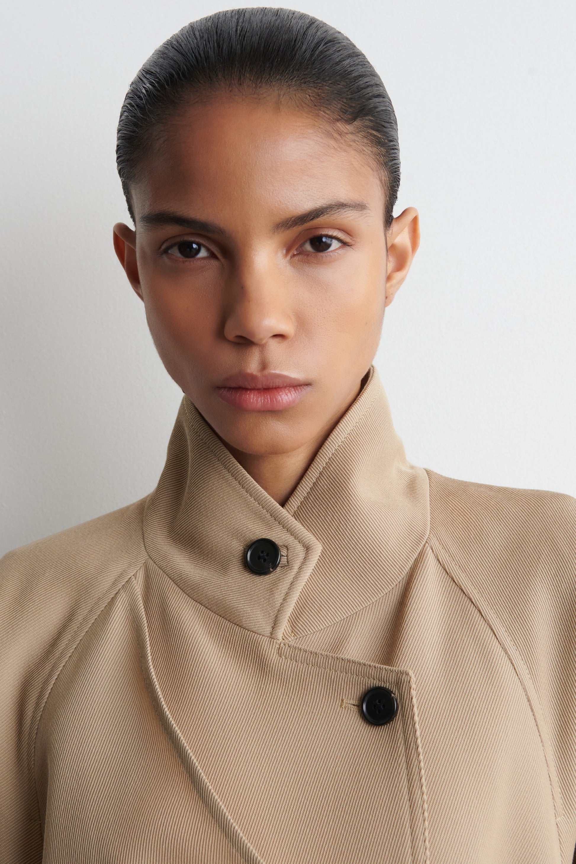 The classic trench is expressed through a modern design language for the upcoming season. Rendered in timeless beige, this belted piece is made from soft wool-blend twill and features a funnel neck, wrap-over lapel and a storm flap. Style it with tailoring for an '80s sensibility.