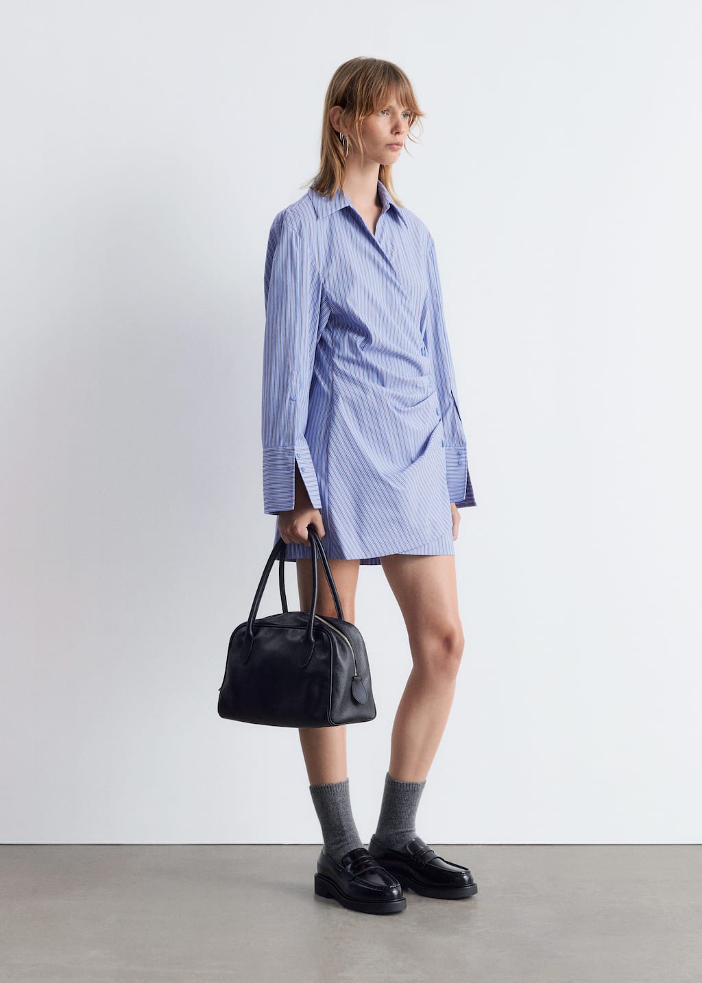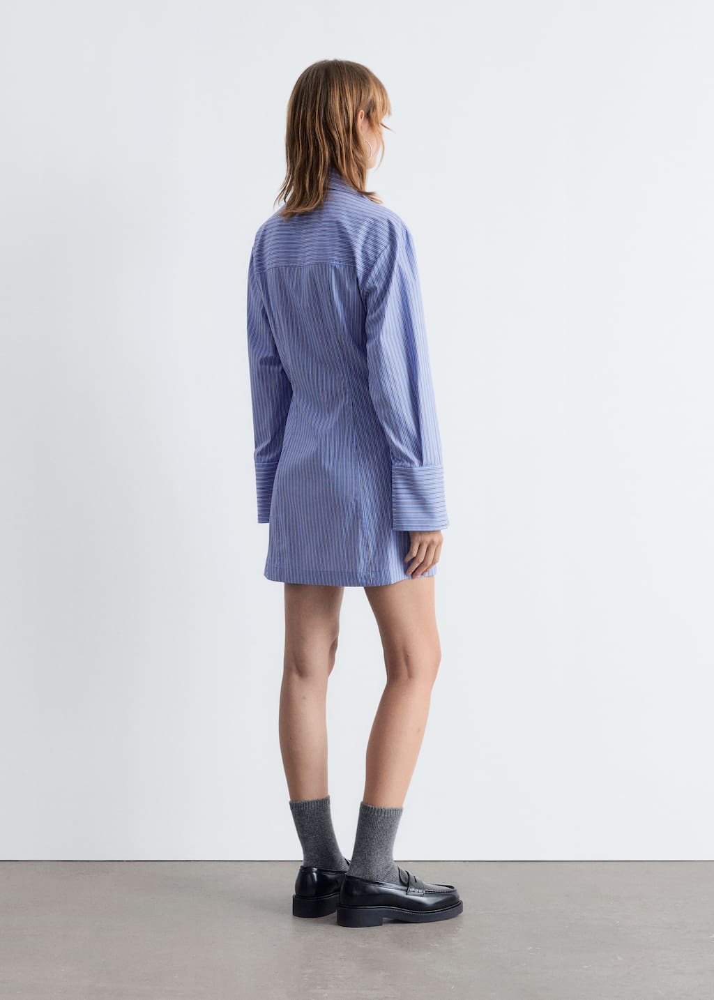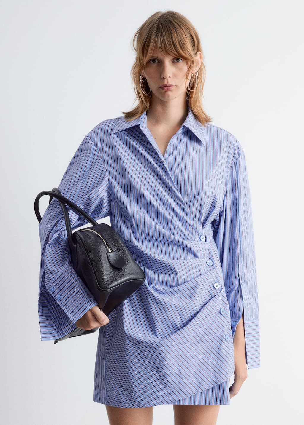 Long-sleeve mini shirt dress featuring a wrap bodice detailed with pleats and button closures.