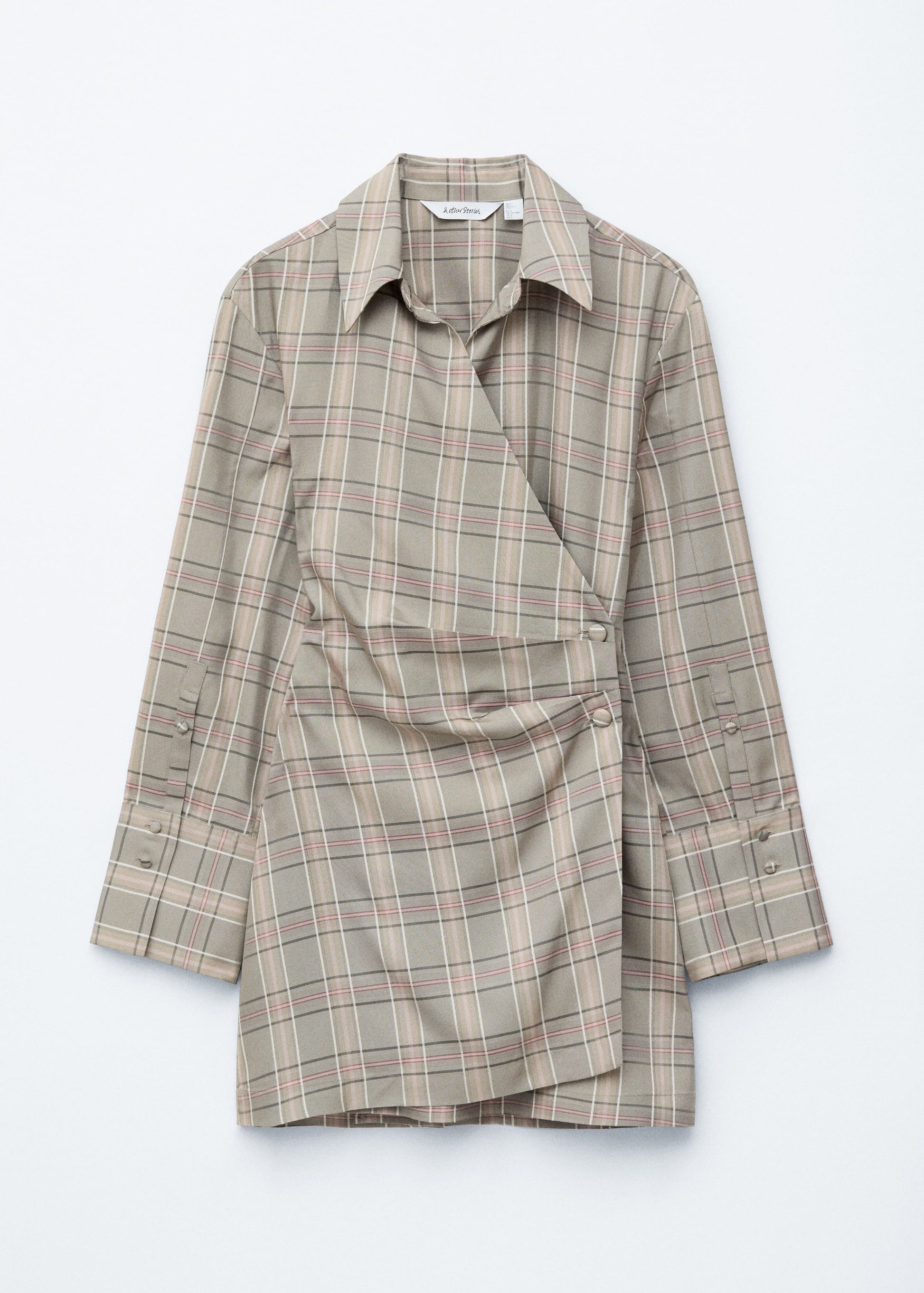 This mini shirt dress is designed with an all-over checked pattern. It features an open collar, a wrap waist with two fixed pleats fastened by buttons, and long sleeves finished with buttoned cuffs.