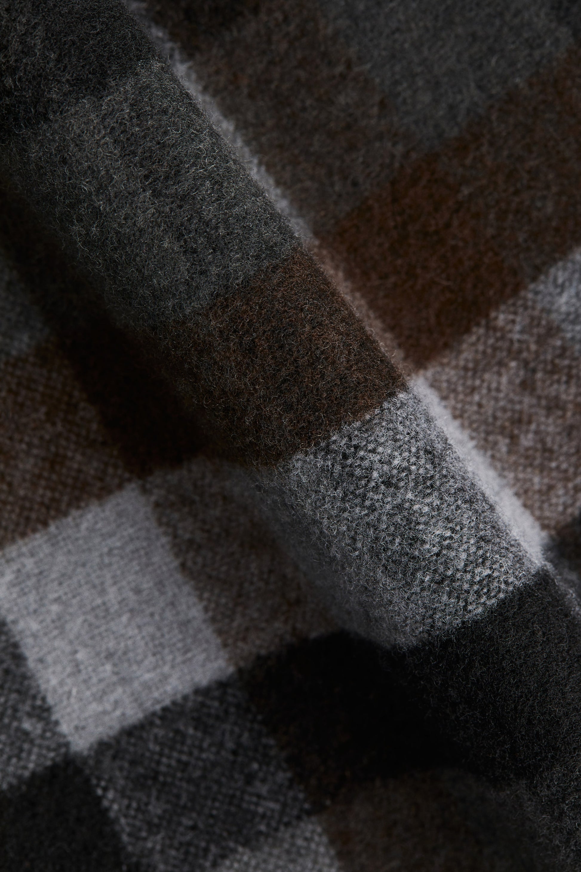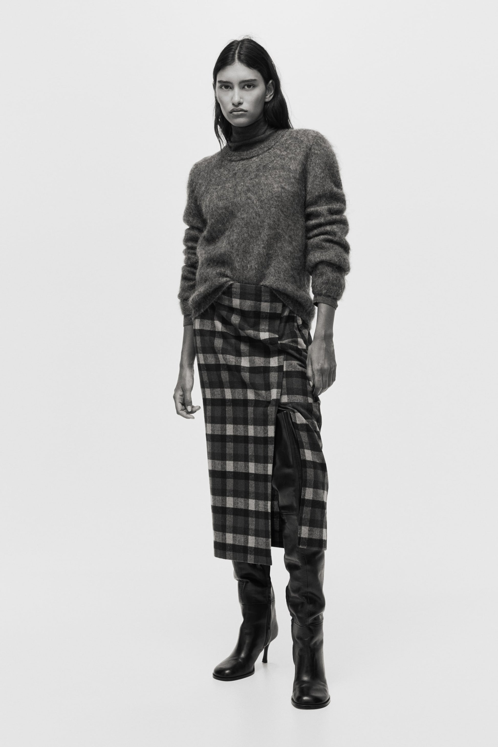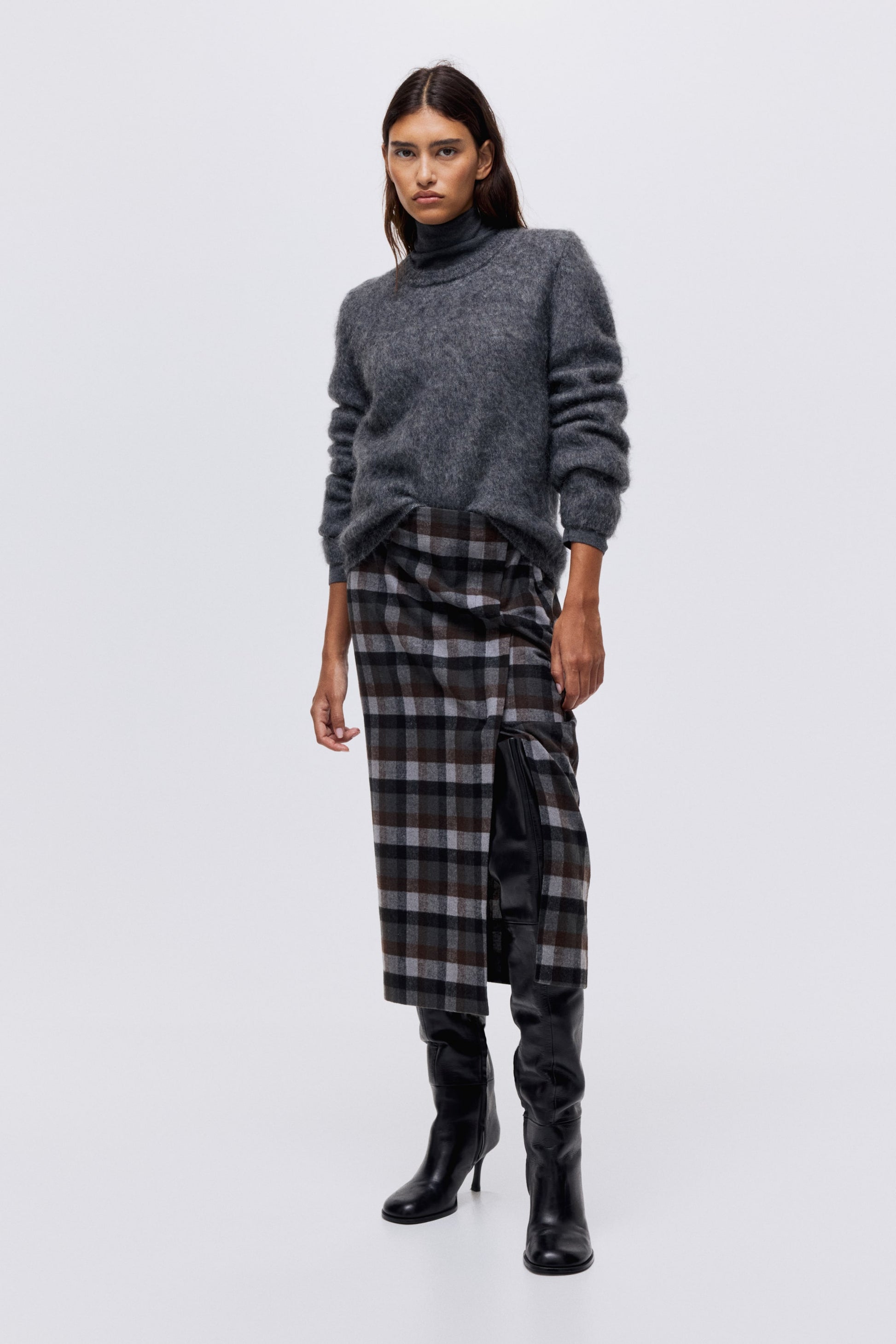 Calf-length skirt in woven fabric with a brushed surface featuring a wrapover front and a zip at one side.