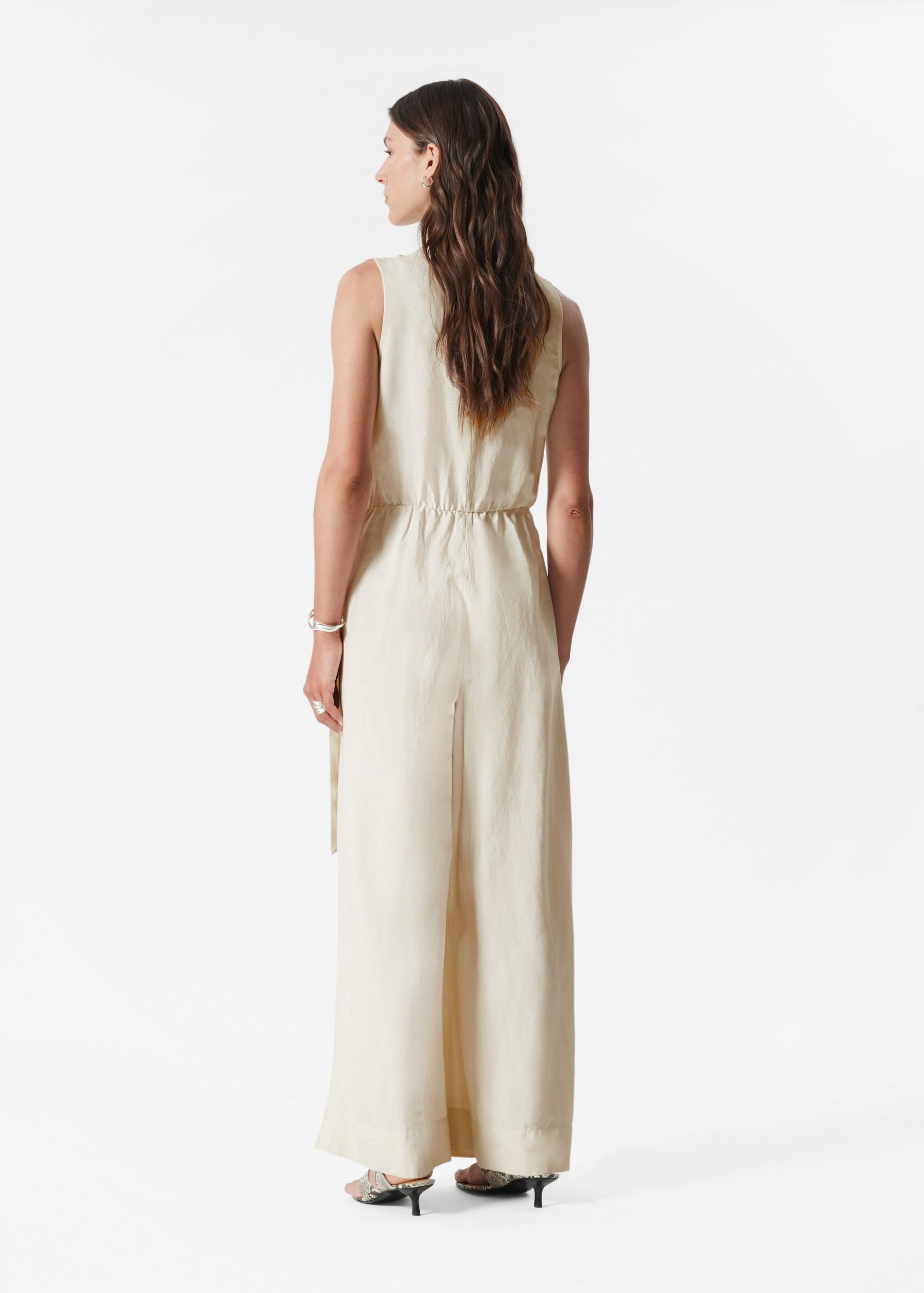 This minimalist jumpsuit is crafted from a lightweight linen-blend. Cut in an airy, sleeveless silhouette it features a classic v-neckline and an asymmetric wrapover design, secured by an adjustable tie-belt at the waist. Finished with elastic ruching at the back for added comfort. A versatile piece, ideal for both festive and casual occasions.
