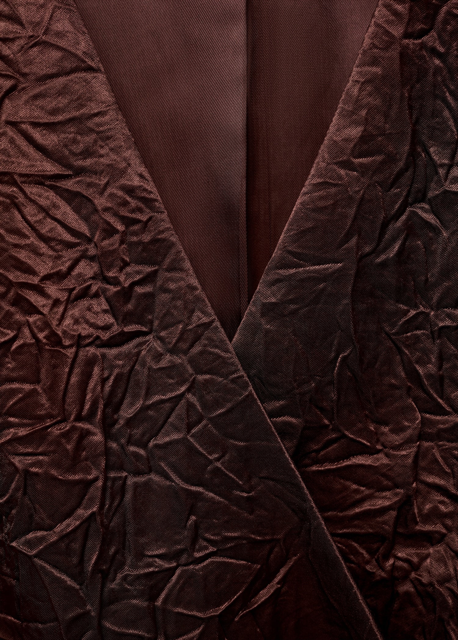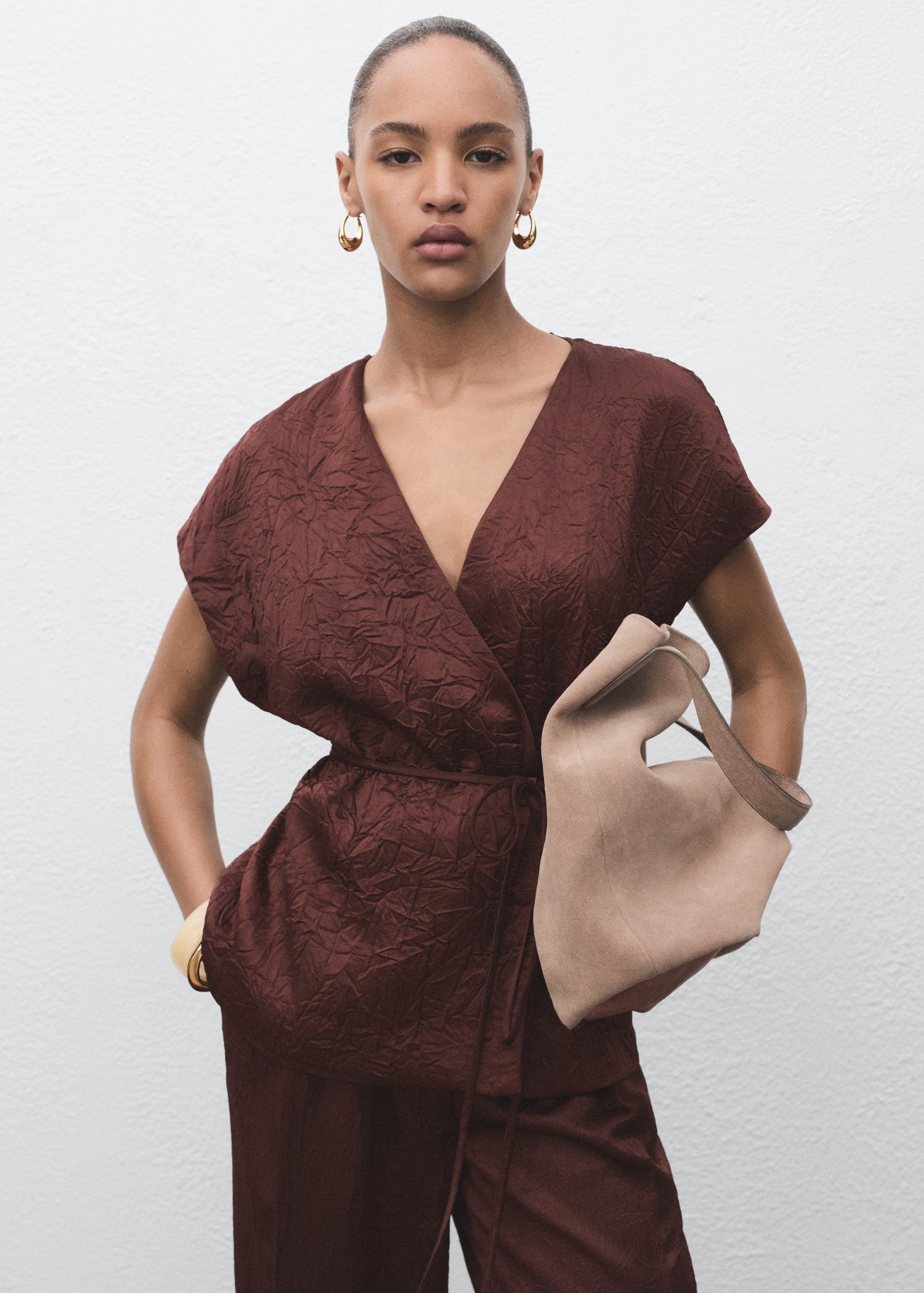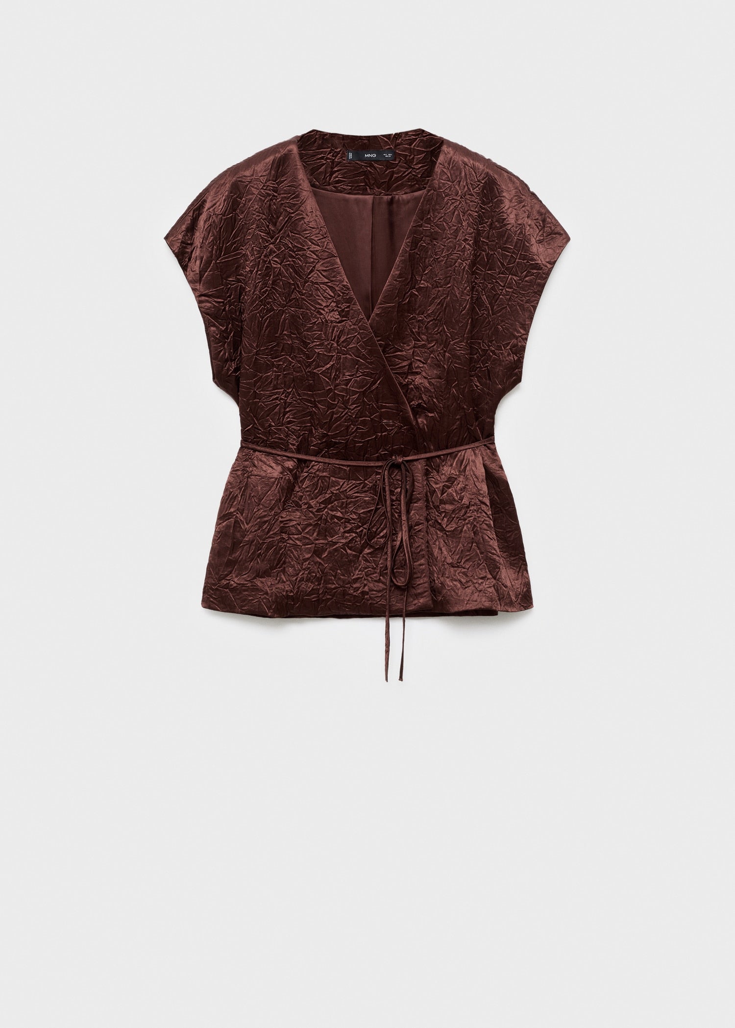 Wrinkled effect. Wrap design. Cross-over V-neck. Short sleeves. Tie closure at the waist. Total look.