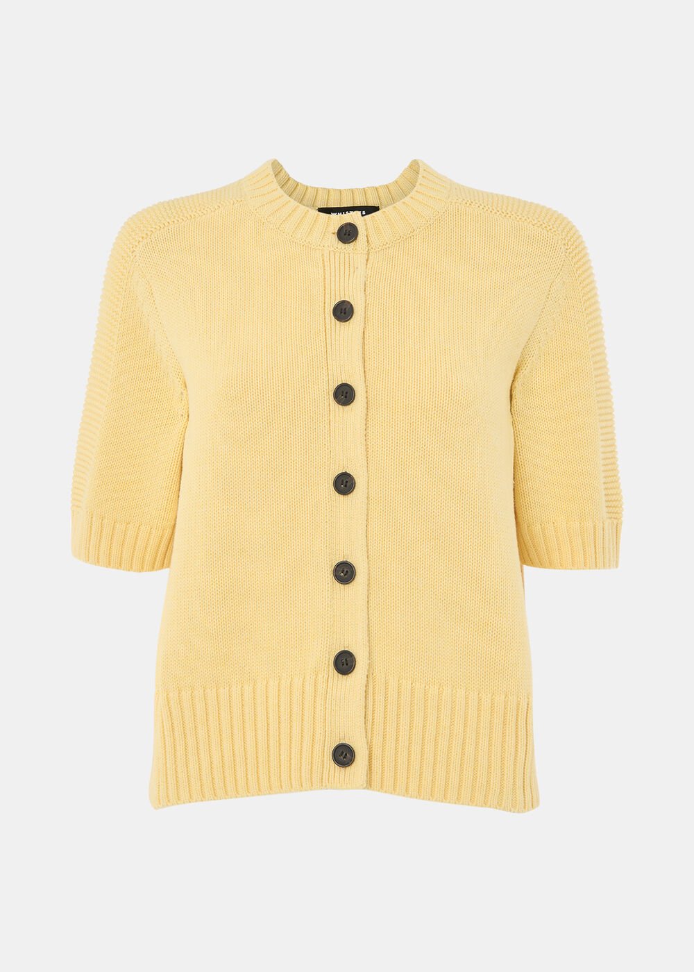 Designed for warm, sunny moments, our Short Sleeve Button Cardigan offers a fresh take on summer knitwear. It arrives in a versatile and vibrant shade of yellow, pairing effortlessly with everything from your favourite jeans and skirts to layered over bikinis at the beach. Its finished with short sleeves, contrasting black buttons and ribbed trims for a modern touch.