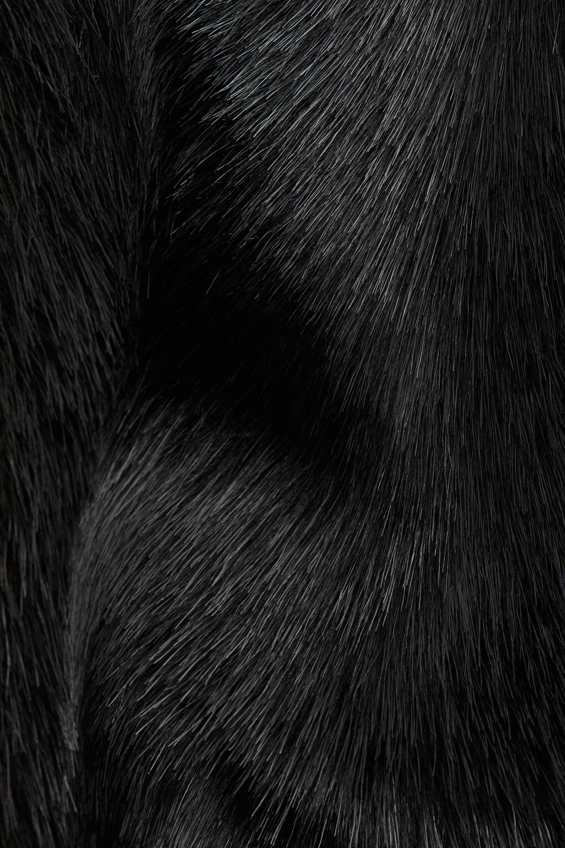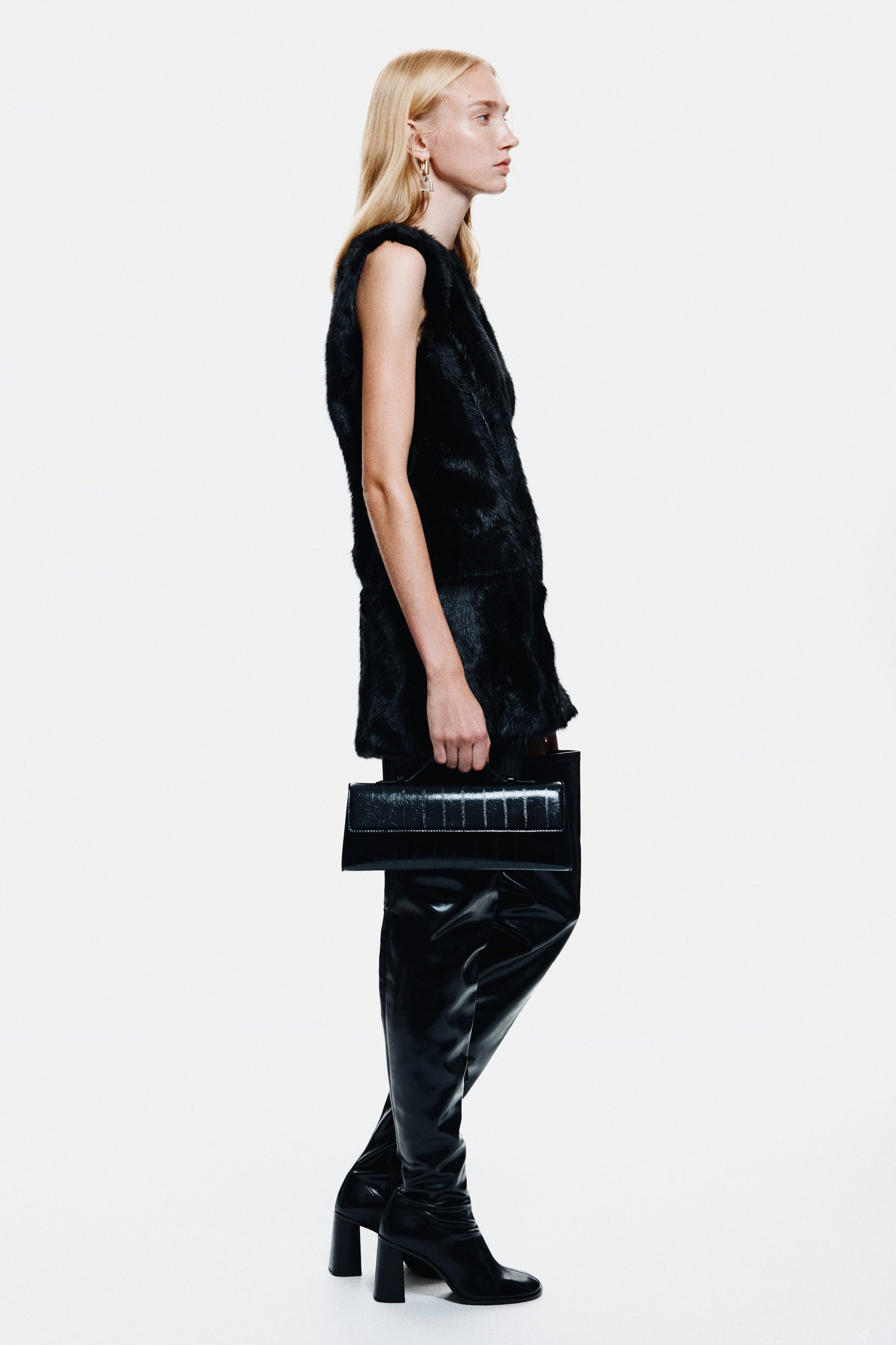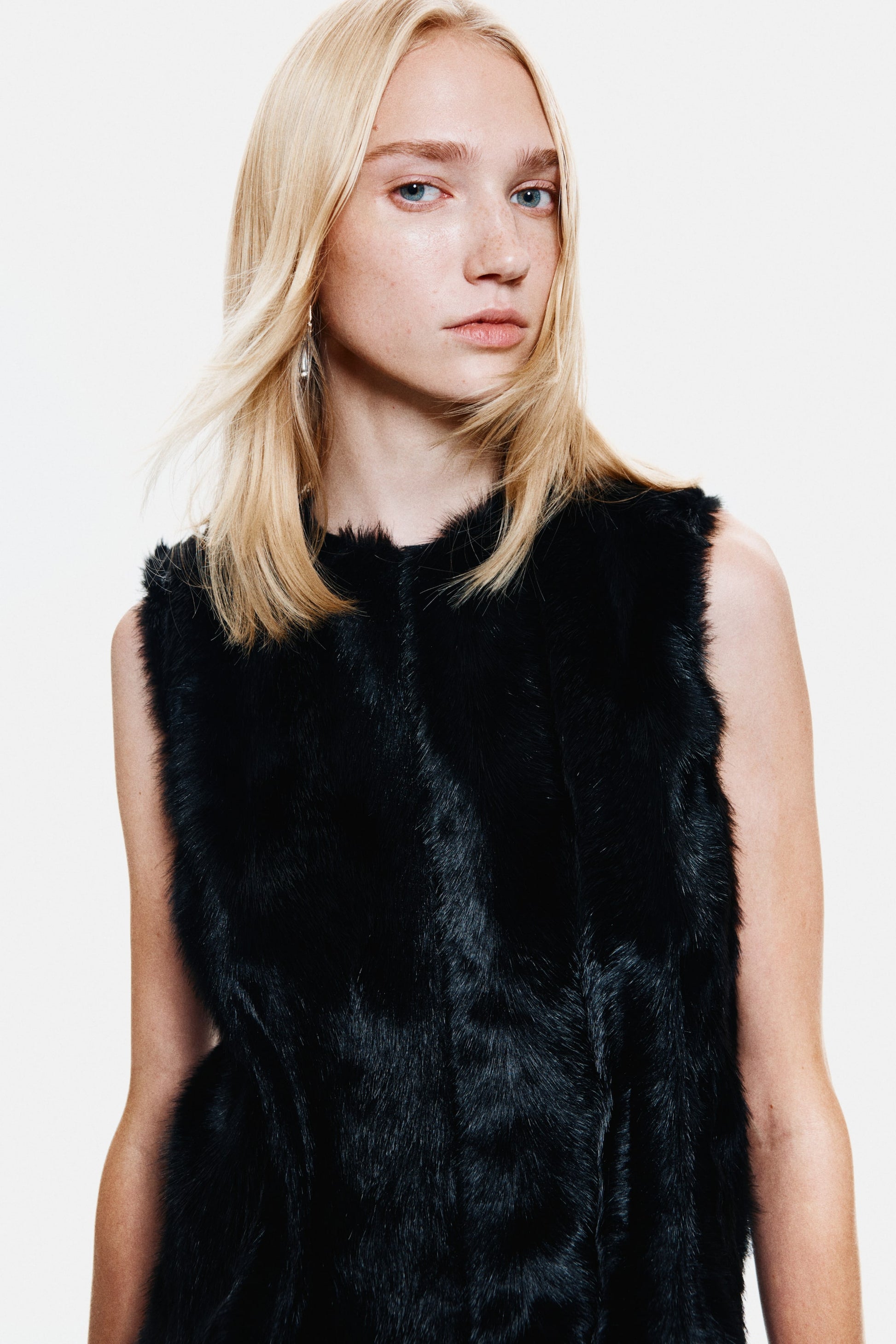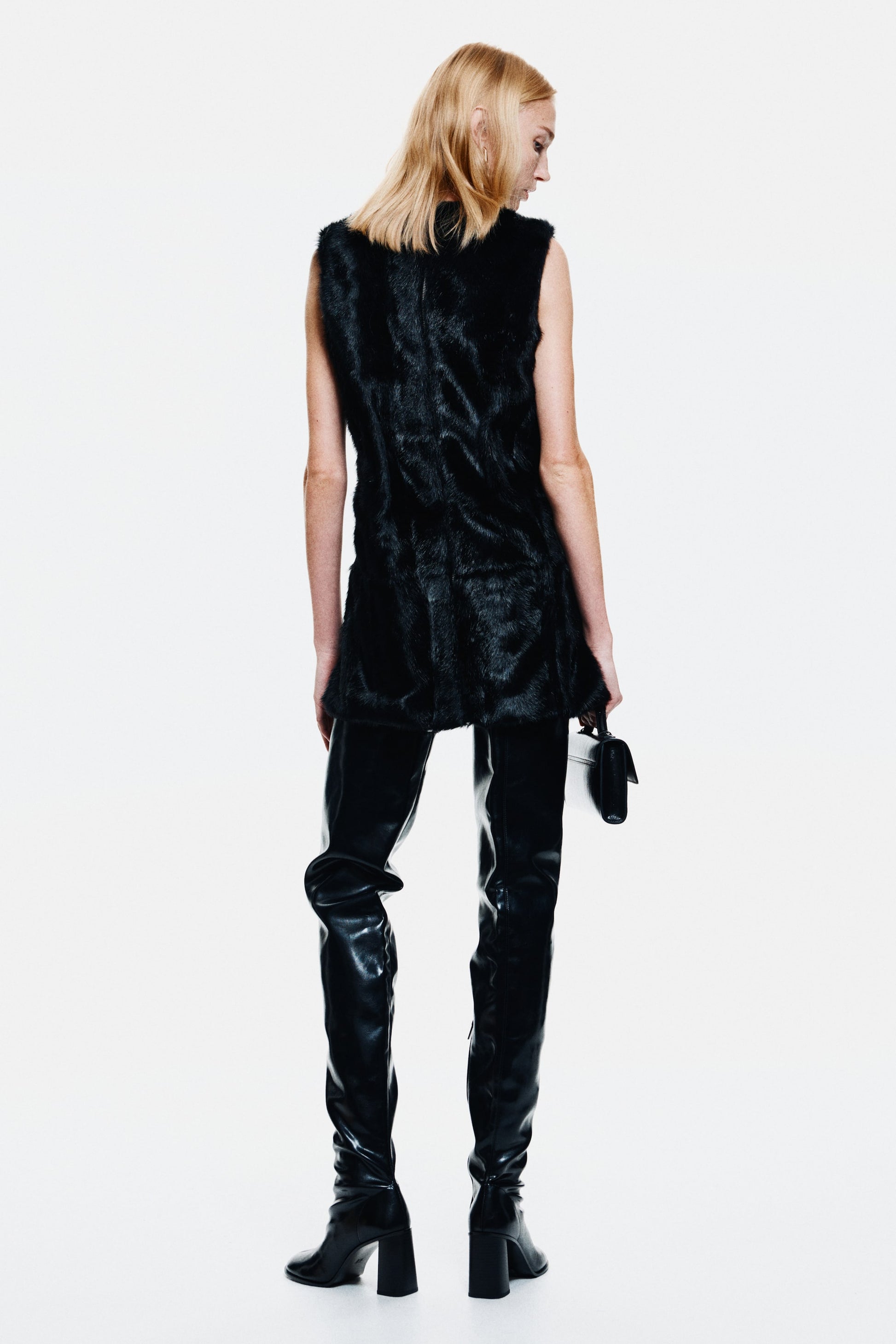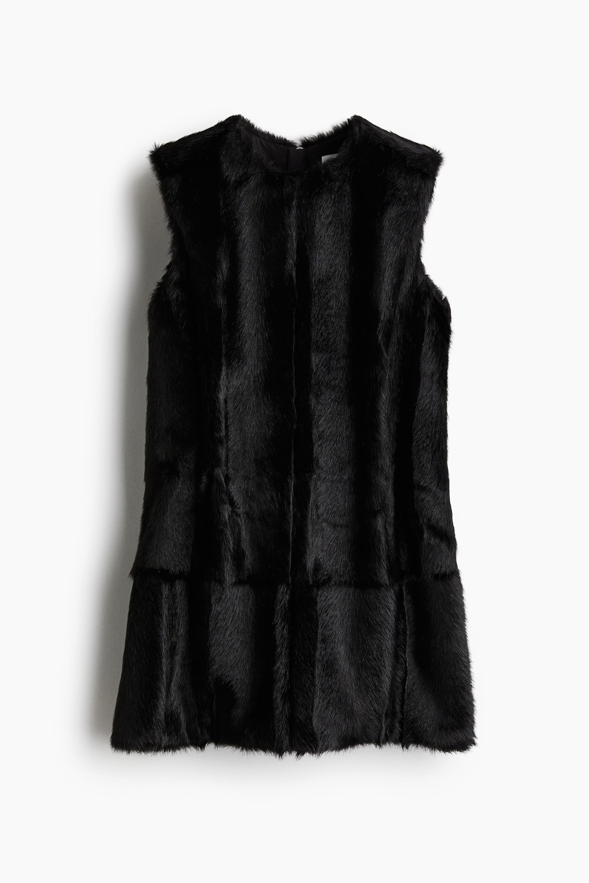 Short, sleeveless dress in soft, fluffy fabric. Features a round neckline and a zip down the back with coated binding. Pleats at the waist and visible seams at the sides and hem. Lined.