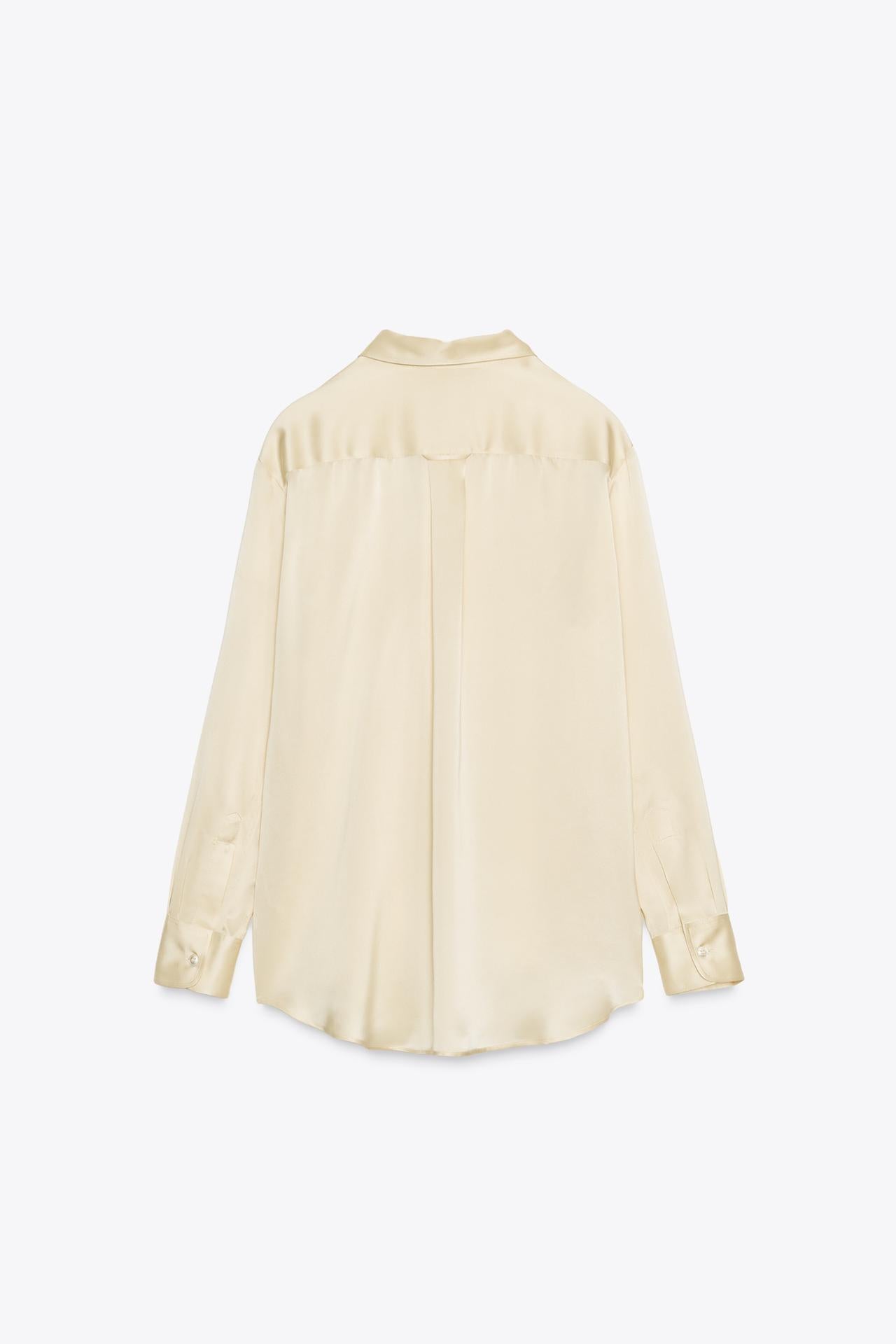 Shirt made from 100% silk yarn. Lapel collar and long sleeve finished with a cuff. Patch pocket on the chest. Asymmetric rounded hem. Front button fastening.
