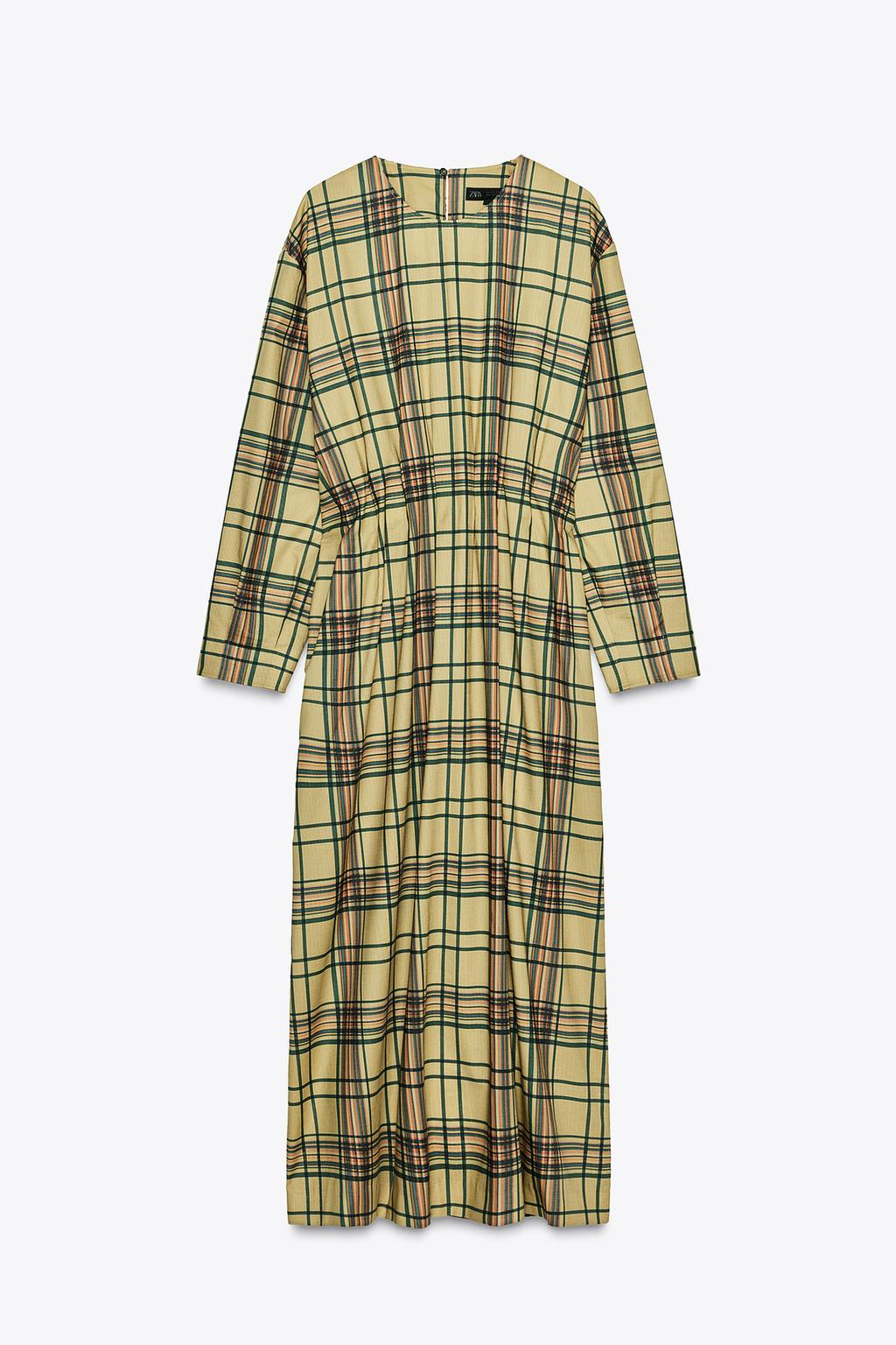 Midi dress made from a cotton and 21% linen blend. Round neck and long sleeve. Pleated detail at the waist. Back fastening with opening and button.
