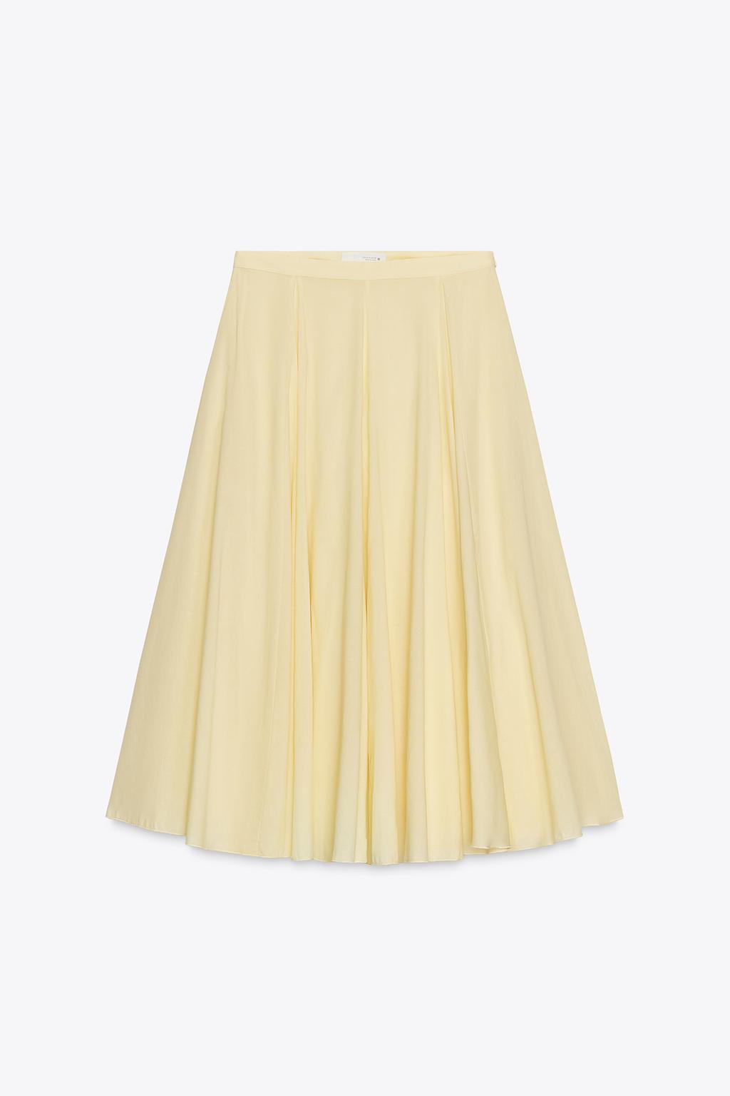 Mid-waist midi skirt made of cotton yarn. Flared hem with pleats in an A-line finish. Side zip fastening concealed in the seam.