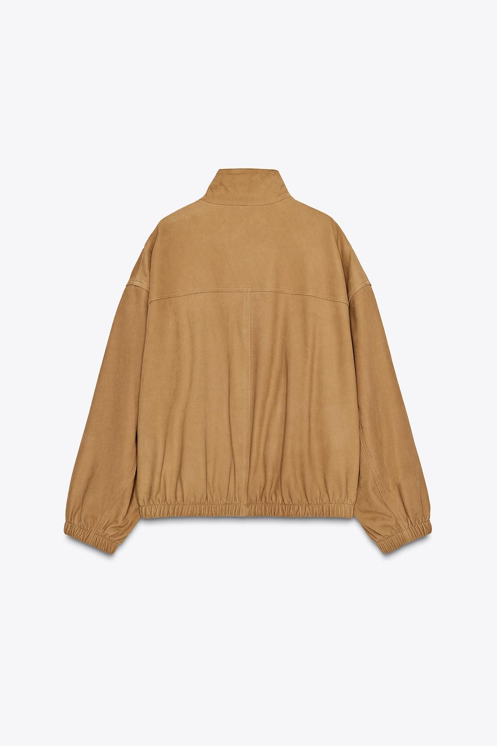 Bomber jacket made from 100% leather. High collar and long sleeves finished with elastic cuffs. Front pockets concealed in the seams. Elasticated hem. Inner lining. Front fastening with contrasting buttons.