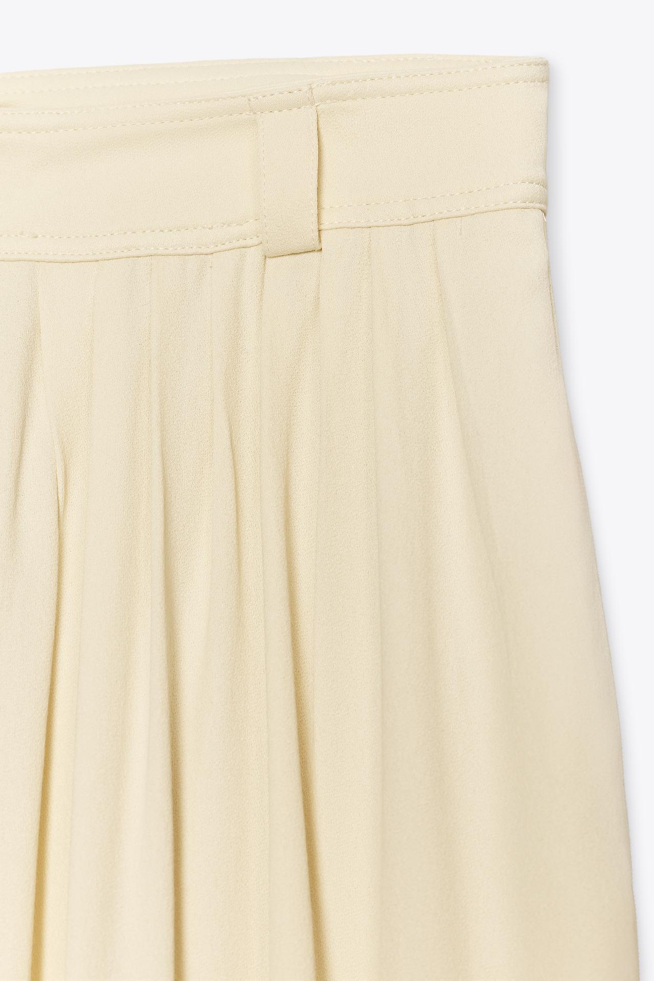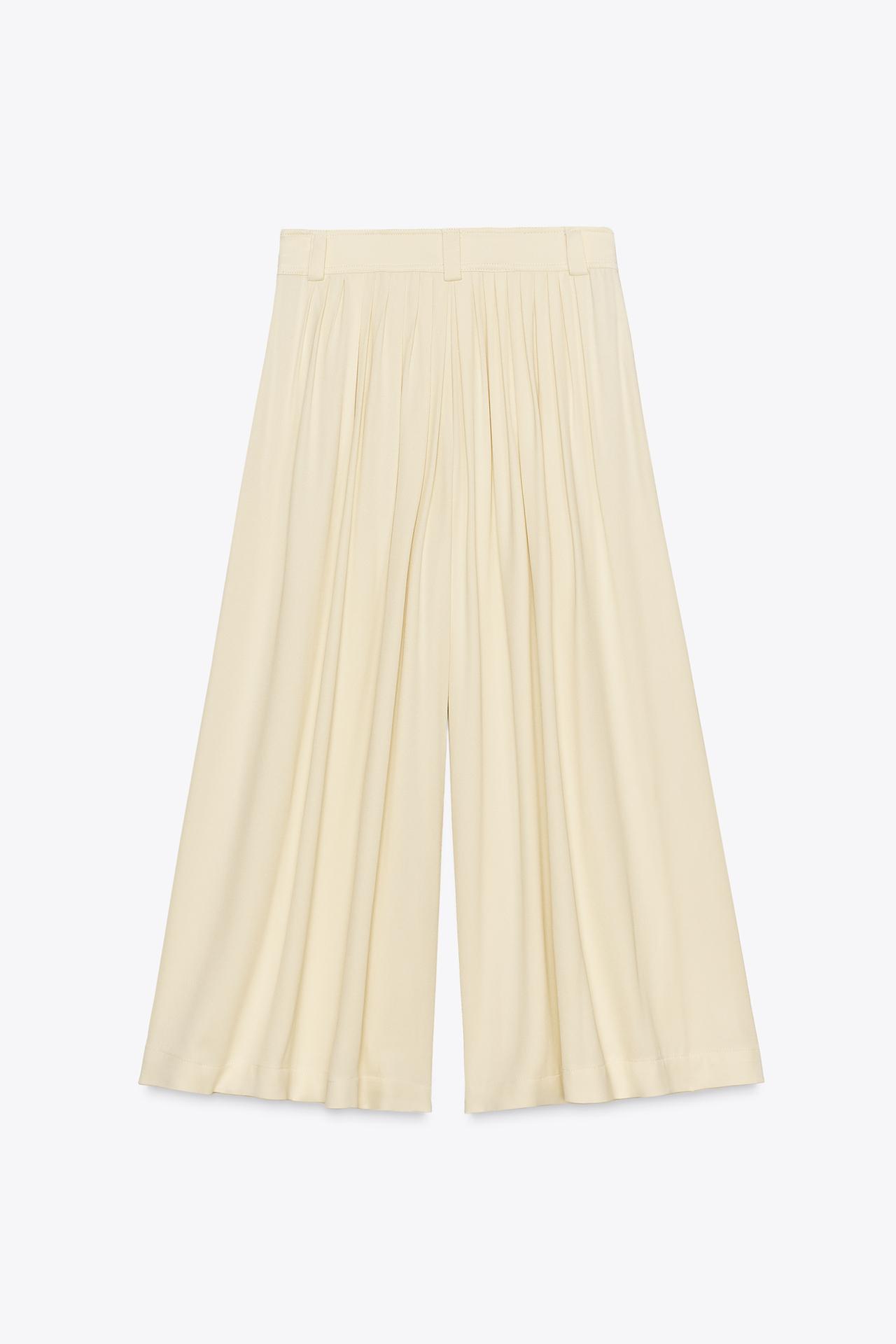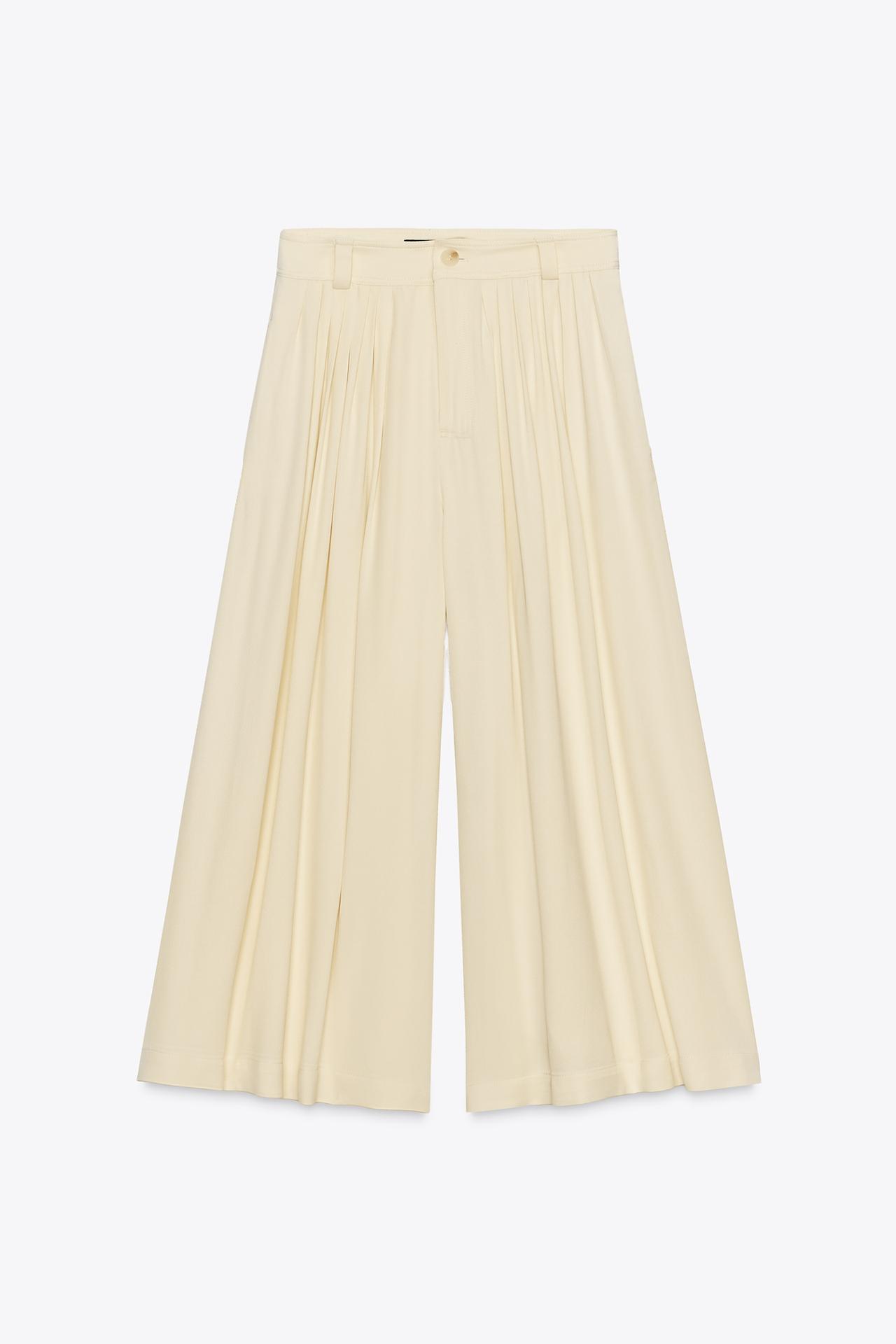 Trousers made from viscose yarn. Mid-rise and waistband with belt loops. Side pockets concealed in the seam. Pleat detail on the waist. Wide leg. Front zip and button fastening.