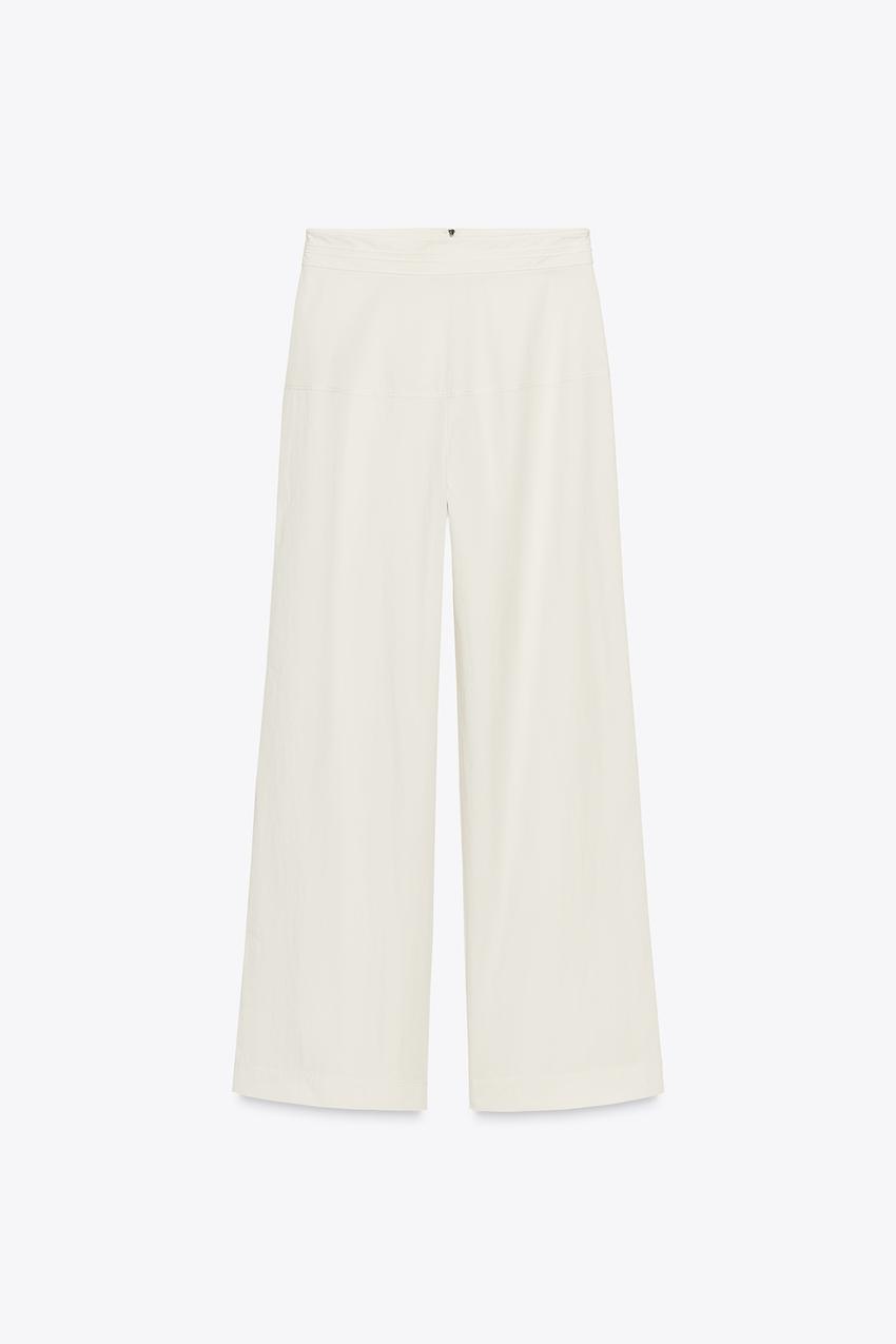 High-waist trousers with matching topstitching detail. Wide leg. Back metal zip fastening.