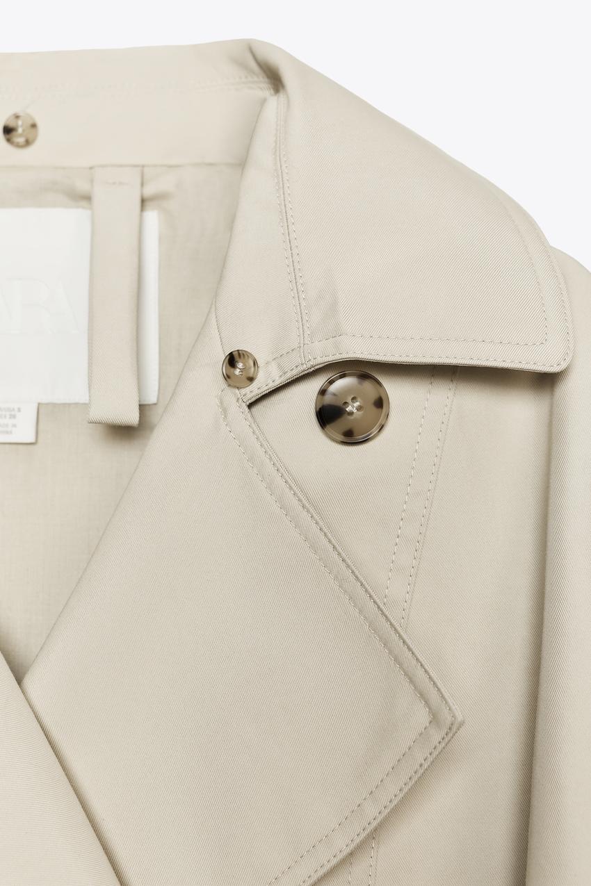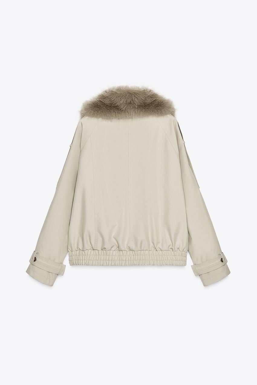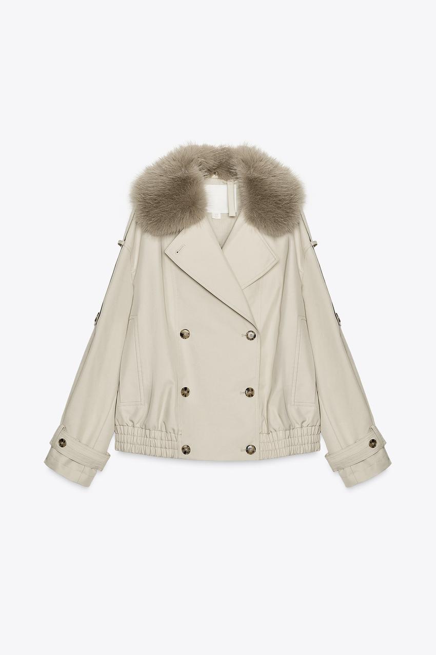 Trench coat with a lapel collar and a detachable faux fur collar. Long sleeves with tabs. Pockets on the front. Elasticated hem. Double-breasted button fastening.